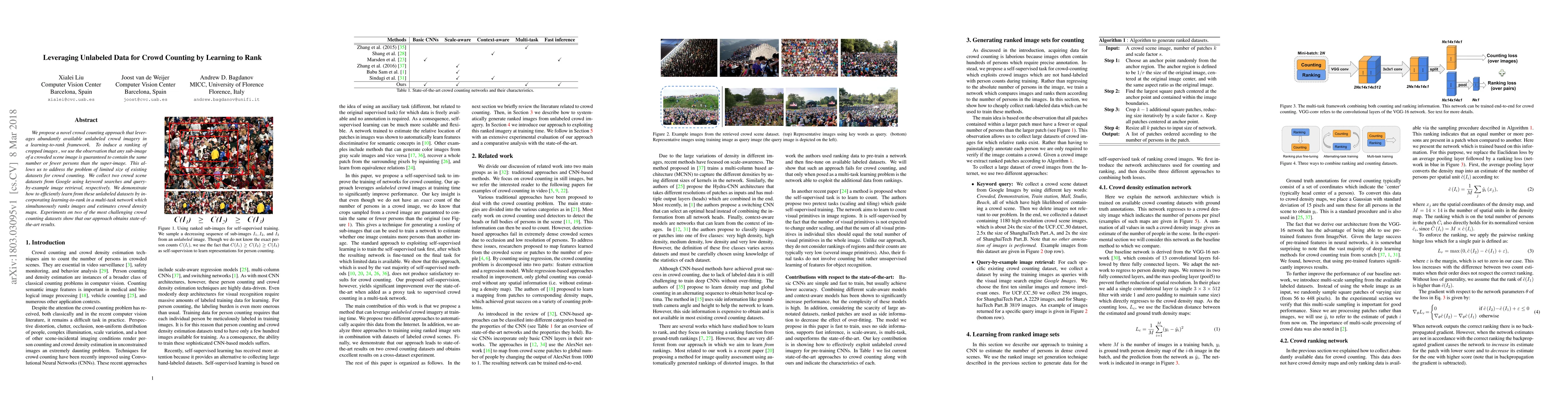 This paper introduces a crowd counting method that utilizes unlabeled crowd imagery through a learning-to-rank framework, achieving state-of-the-art results by leveraging the observation that sub-images of crowded scenes contain the same or fewer persons. The approach effectively addresses dataset size limitations and improves crowd density estimation.