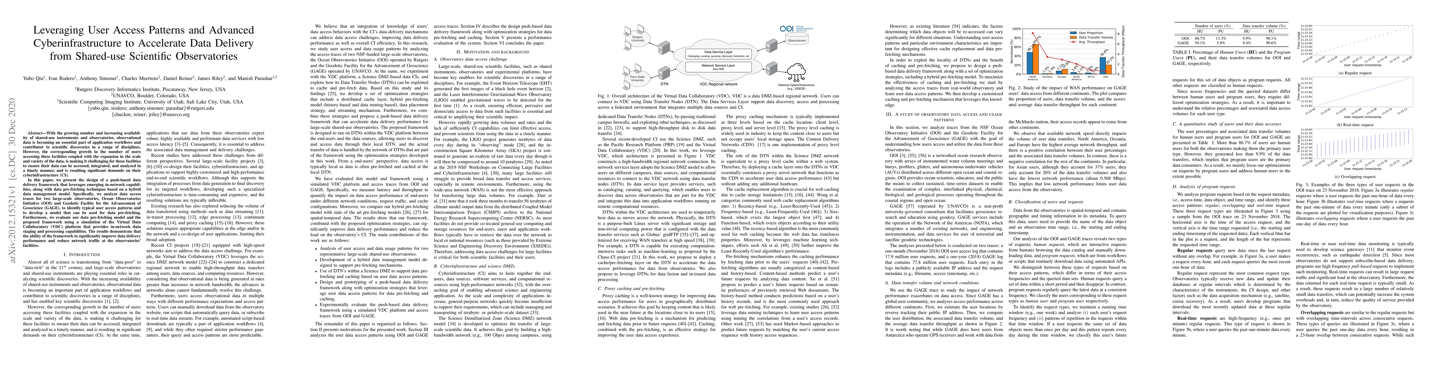 With the growing number and increasing availability of shared-use instruments and observatories, observational data is becoming an essential part of application workflows and contributor to scientific discoveries in a range of disciplines. However, the corresponding growth in the number of users accessing these facilities coupled with the expansion in the scale and variety of the data, is making it challenging for these facilities to ensure their data can be accessed, integrated, and analyzed in a timely manner, and is resulting significant demands on their cyberinfrastructure (CI). In this paper, we present the design of a push-based data delivery framework that leverages emerging in-network capabilities, along with data pre-fetching techniques based on a hybrid data management model. Specifically, we analyze data access traces for two large-scale observatories, Ocean Observatories Initiative (OOI) and Geodetic Facility for the Advancement of Geoscience (GAGE), to identify typical user access patterns and to develop a model that can be used for data pre-fetching. Furthermore, we evaluate our data pre-fetching model and the proposed framework using a simulation of the Virtual Data Collaboratory (VDC) platform that provides in-network data staging and processing capabilities. The results demonstrate that the ability of the framework to significantly improve data delivery performance and reduce network traffic at the observatories' facilities.
