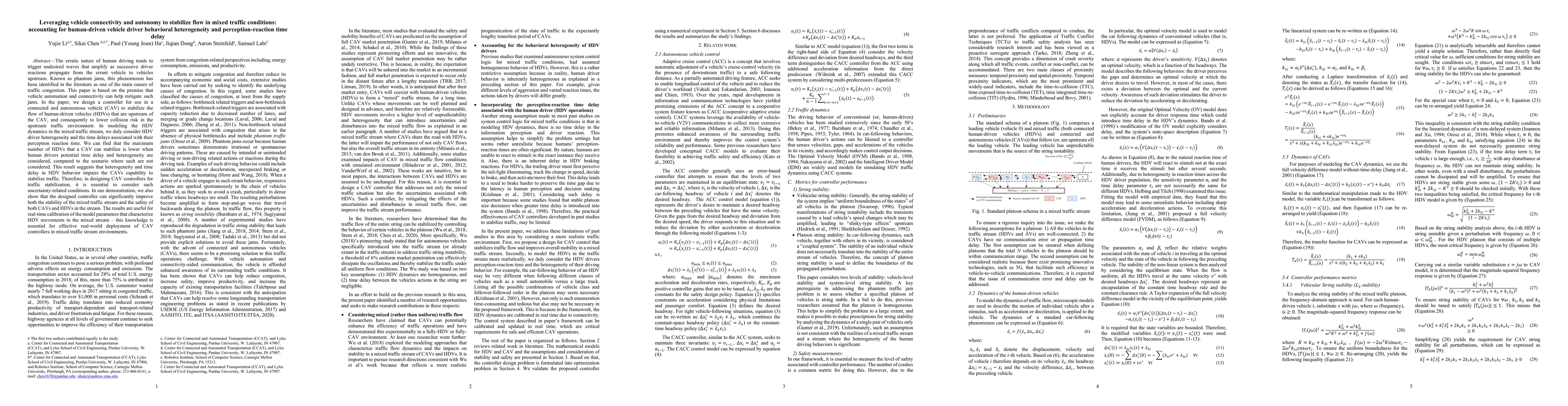 The erratic nature of human driving tends to trigger undesired waves that amplify as successive driver reactions propagate from the errant vehicle to vehicles upstream. Known as phantom jams, this phenomenon has been identified in the literature as one of the main causes of traffic congestion. This paper is based on the premise that vehicle automation and connectivity can help mitigate such jams. In the paper, we design a controller for use in a connected and autonomous vehicle (CAV) to stabilize the flow of human-driven vehicles (HDVs) that are upstream of the CAV, and consequently to lower collision risk in the upstream traffic environment. In modeling the HDV dynamics in the mixed traffic stream, we duly consider HDV driver heterogeneity and the time delays associated with their perception reaction time. We can find that the maximum number of HDVs that a CAV can stabilize is lower when human drivers potential time delay and heterogeneity are considered, compared to the scenario where such are not considered. This result suggests that heterogeneity and time delay in HDV behavior impairs the CAVs capability to stabilize traffic. Therefore, in designing CAV controllers for traffic stabilization, it is essential to consider such uncertainty-related conditions. In our demonstration, we also show that the designed controller can significantly improve both the stability of the mixed traffic stream and the safety of both CAVs and HDVs in the stream. The results are useful for real-time calibration of the model parameters that characterize HDV movements in the mixed stream.