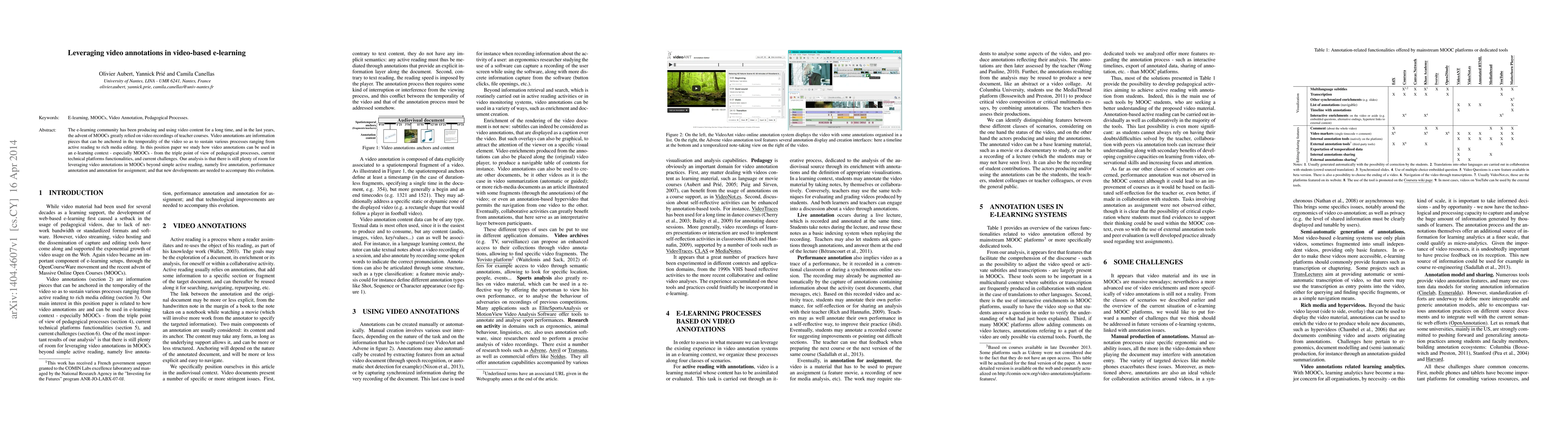 The e-learning community has been producing and using video content for a long time, and in the last years, the advent of MOOCs greatly relied on video recordings of teacher courses. Video annotations are information pieces that can be anchored in the temporality of the video so as to sustain various processes ranging from active reading to rich media editing. In this position paper we study how video annotations can be used in an e-learning context - especially MOOCs - from the triple point of view of pedagogical processes, current technical platforms functionalities, and current challenges. Our analysis is that there is still plenty of room for leveraging video annotations in MOOCs beyond simple active reading, namely live annotation, performance annotation and annotation for assignment; and that new developments are needed to accompany this evolution.