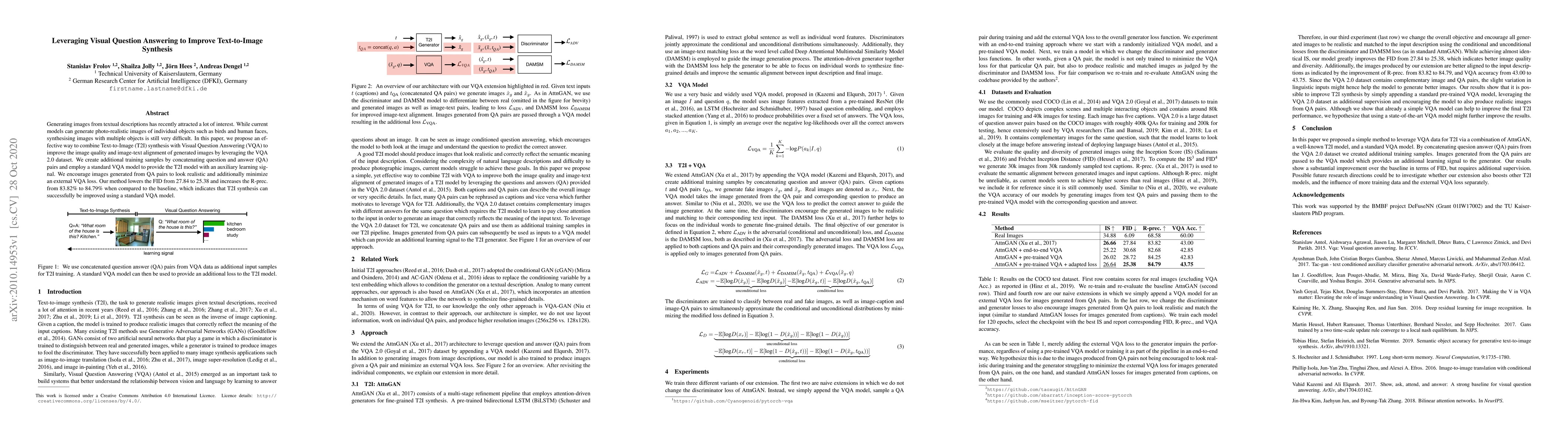 Generating images from textual descriptions has recently attracted a lot of interest. While current models can generate photo-realistic images of individual objects such as birds and human faces, synthesising images with multiple objects is still very difficult. In this paper, we propose an effective way to combine Text-to-Image (T2I) synthesis with Visual Question Answering (VQA) to improve the image quality and image-text alignment of generated images by leveraging the VQA 2.0 dataset. We create additional training samples by concatenating question and answer (QA) pairs and employ a standard VQA model to provide the T2I model with an auxiliary learning signal. We encourage images generated from QA pairs to look realistic and additionally minimize an external VQA loss. Our method lowers the FID from 27.84 to 25.38 and increases the R-prec. from 83.82% to 84.79% when compared to the baseline, which indicates that T2I synthesis can successfully be improved using a standard VQA model.
