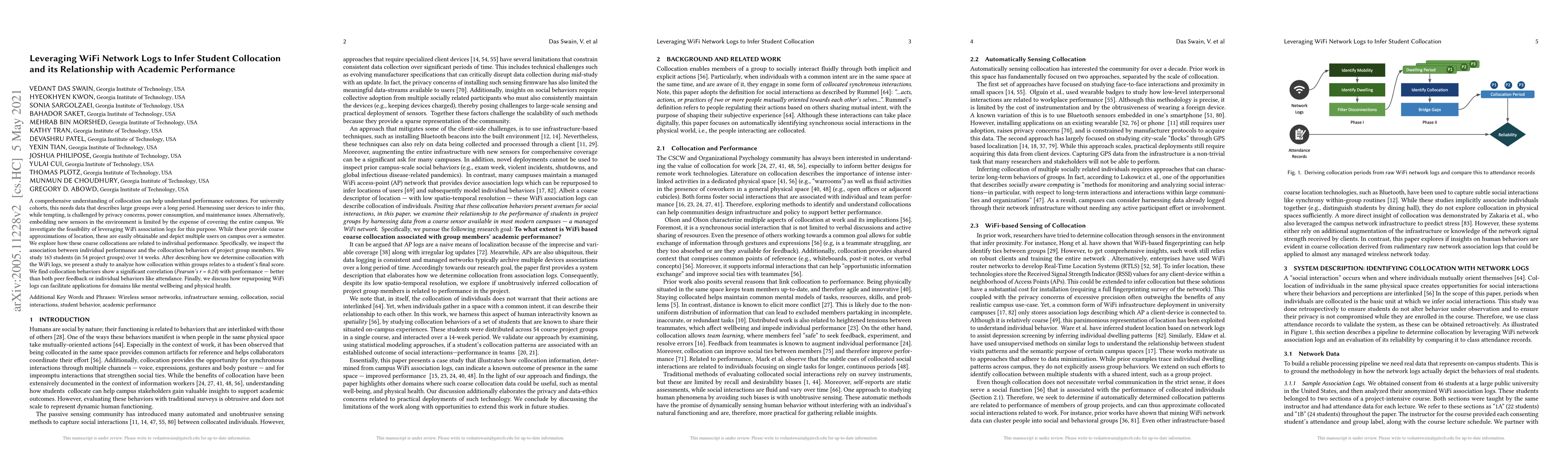 Researchers found that collocation behaviors of students in project groups correlate with their final scores, suggesting a connection between social interaction and academic performance. This study explores the feasibility of using WiFi association logs to analyze student behavior and provides insights for applications like mental wellbeing and physical health.