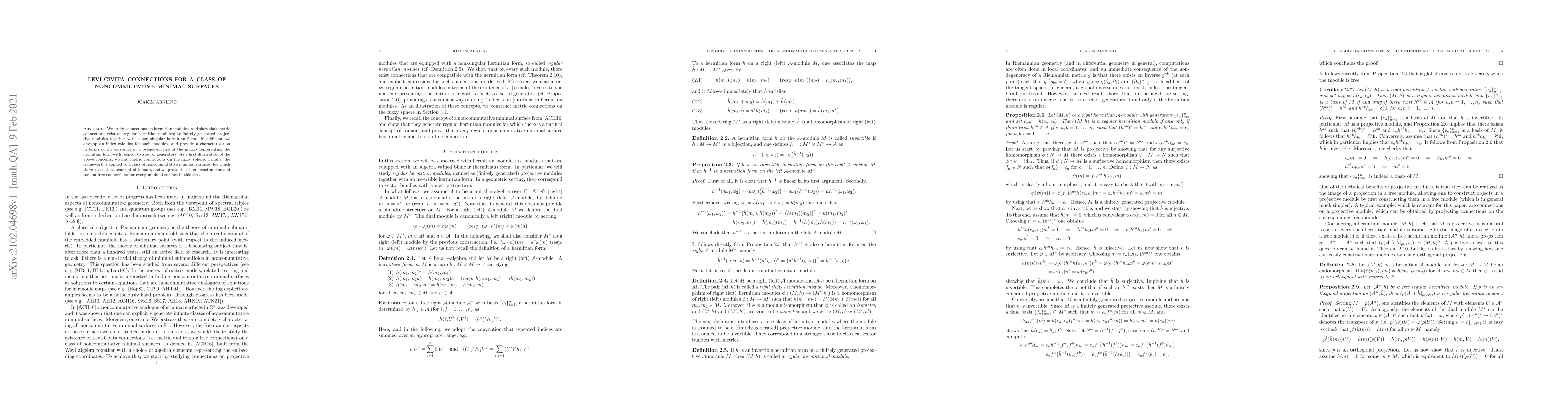 We study connections on hermitian modules, and show that metric connections exist on regular hermitian modules; i.e finitely generated projective modules together with a non-singular hermitian form. In addition, we develop an index calculus for such modules, and provide a characterization in terms of the existence of a pseudo-inverse of the matrix representing the hermitian form with respect to a set of generators. As a first illustration of the above concepts, we find metric connections on the fuzzy sphere. Finally, the framework is applied to a class of noncommutative minimal surfaces, for which there is a natural concept of torsion, and we prove that there exist metric and torsion-free connections for every minimal surface in this class.