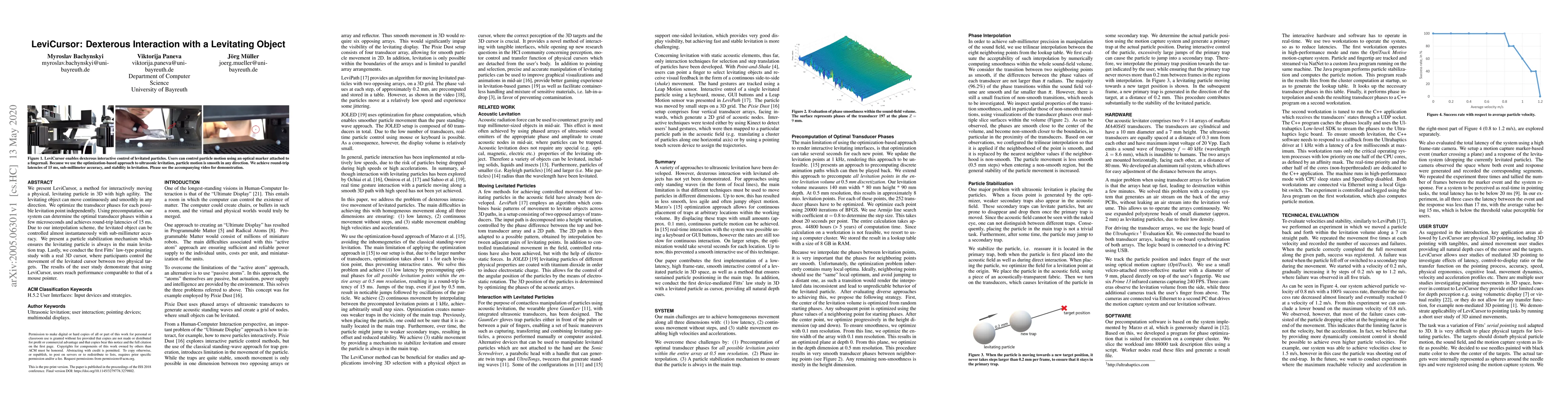 LeviCursor enables high-precision, 3D manipulation of a levitating particle through optimized transducer phases and sub-millimeter accuracy, achieving comparable user performance to a mouse pointer in a Fitts' law study. The system stabilizes the particle and operates with minimal latency.