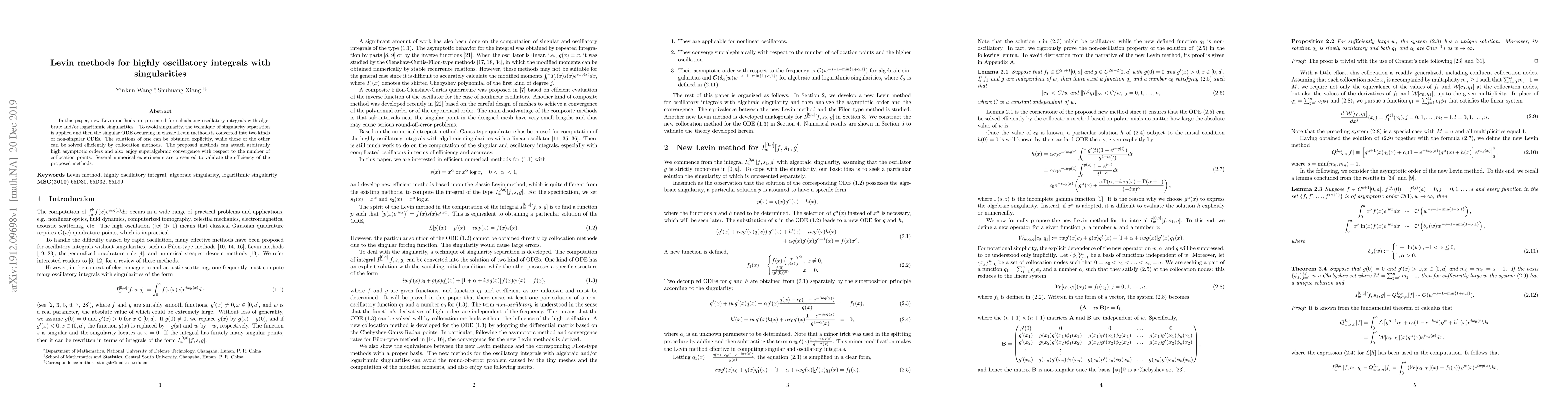 This paper introduces new Levin methods for evaluating highly oscillatory integrals with singularities, employing singularity separation and converting singular ODEs into non-singular ones for efficient computation. The methods achieve high asymptotic orders and superalgebraic convergence, validated through numerical experiments.