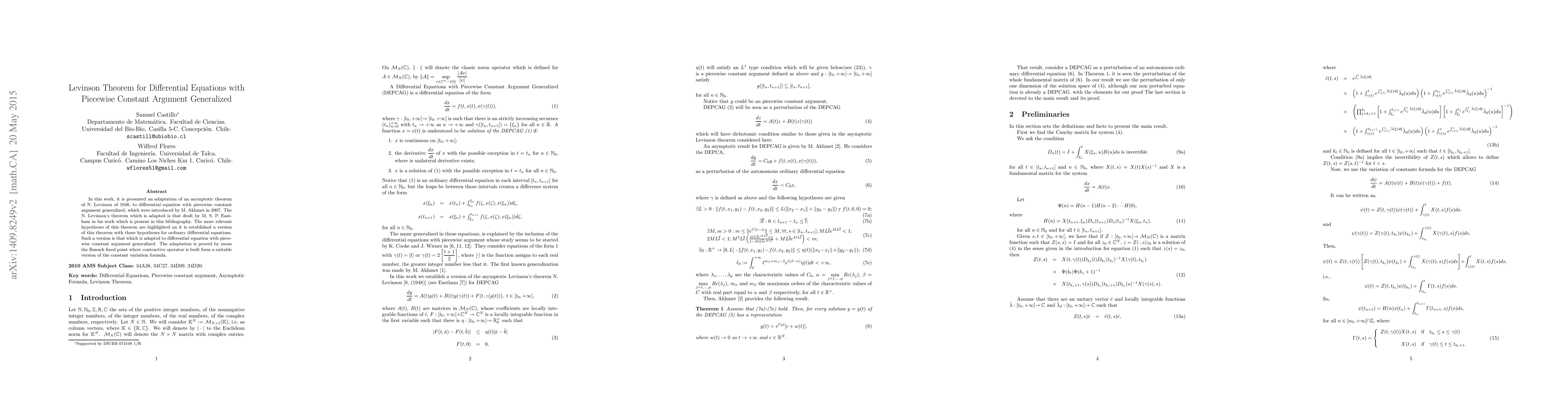This paper adapts N. Levinson's 1948 asymptotic theorem to ordinary differential equations with piecewise constant arguments, specifically delayed cases introduced by M. Akhmet. The adaptation is proven using the Banach fixed point theorem and a contractive operator derived from a modified constant variation formula.