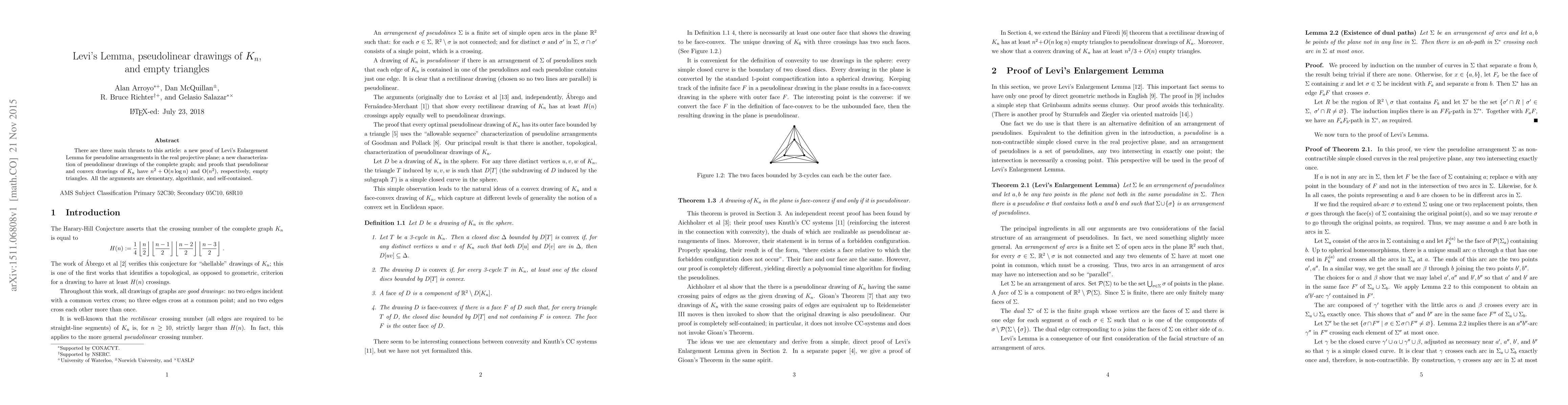 There are three main thrusts to this article: a new proof of Levi's Enlargement Lemma for pseudoline arrangements in the real projective plane; a new characterization of pseudolinear drawings of the complete graph; and proofs that pseudolinear and convex drawings of $K_n$ have $n^2+{}$O$(n\log n)$ and O$(n^2)$, respectively, empty triangles. All the arguments are elementary, algorithmic, and self-contained.