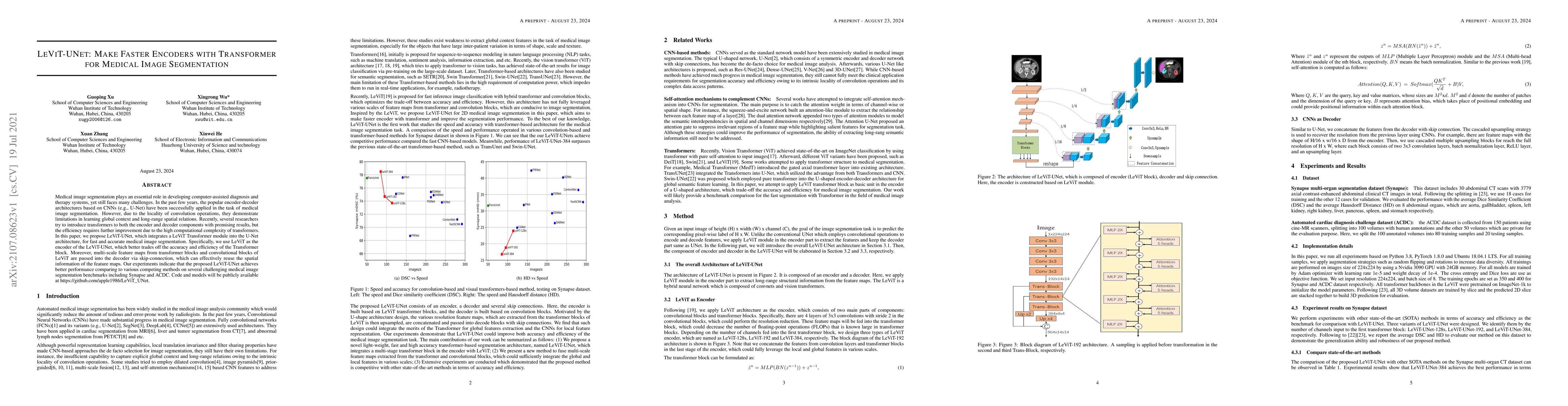 LeViT-UNet integrates a LeViT Transformer module into the U-Net architecture to enhance both speed and accuracy in medical image segmentation. The proposed method effectively balances transformer efficiency and convolutional spatial information reuse, outperforming other methods on medical benchmarks.