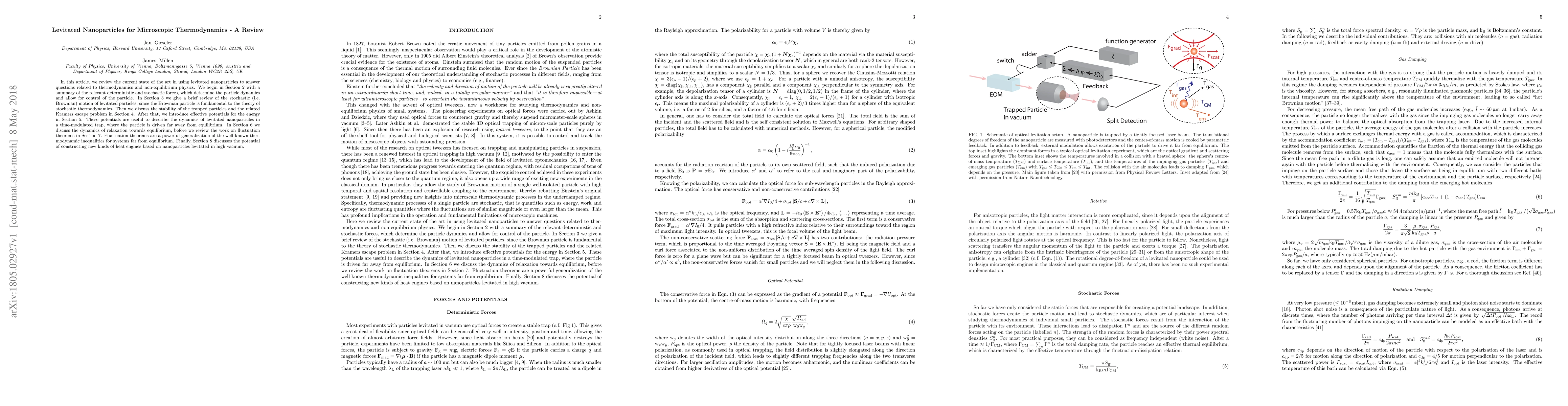 This review explores the use of levitated nanoparticles to investigate microscopic thermodynamics and non-equilibrium physics, detailing the dynamics governed by deterministic and stochastic forces, and discussing the implications for understanding relaxation towards equilibrium and fluctuation theorems. It also explores the potential for developing novel heat engines using these particles.