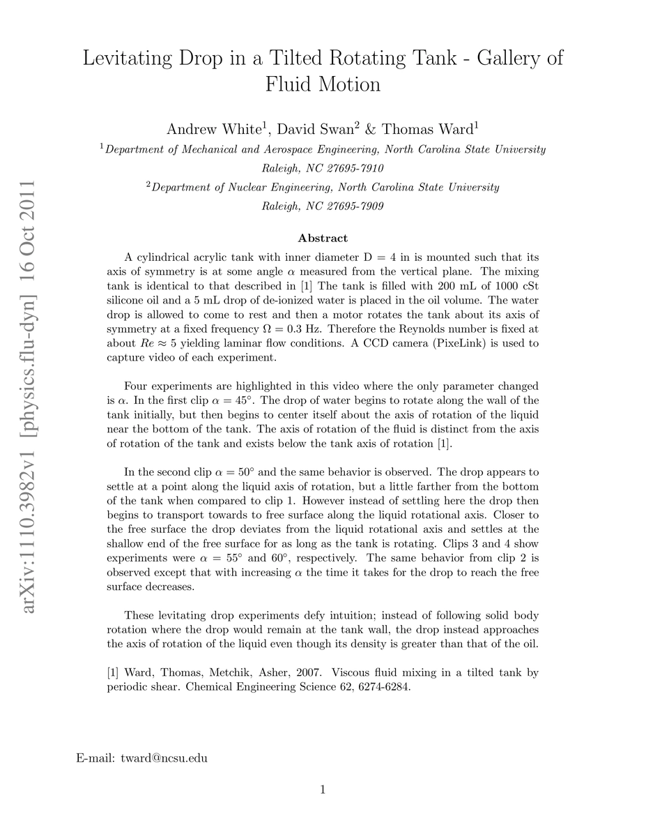 A cylindrical acrylic tank with inner diameter D = 4 in. is mounted such that its axis of symmetry is at some angle measured from the vertical plane. The mixing tank is identical to that described in [1] The tank is filled with 200 mL of 1000 cSt silicone oil and a 5 mL drop of de-ionized water is placed in the oil volume. The water drop is allowed to come to rest and then a motor rotates the tank about its axis of symmetry at a fixed frequency = 0.3 Hz. Therefore the Reynolds number is fixed at about Re ~ 5 yielding laminar flow conditions. A CCD camera (PixeLink) is used to capture video of each experiment.