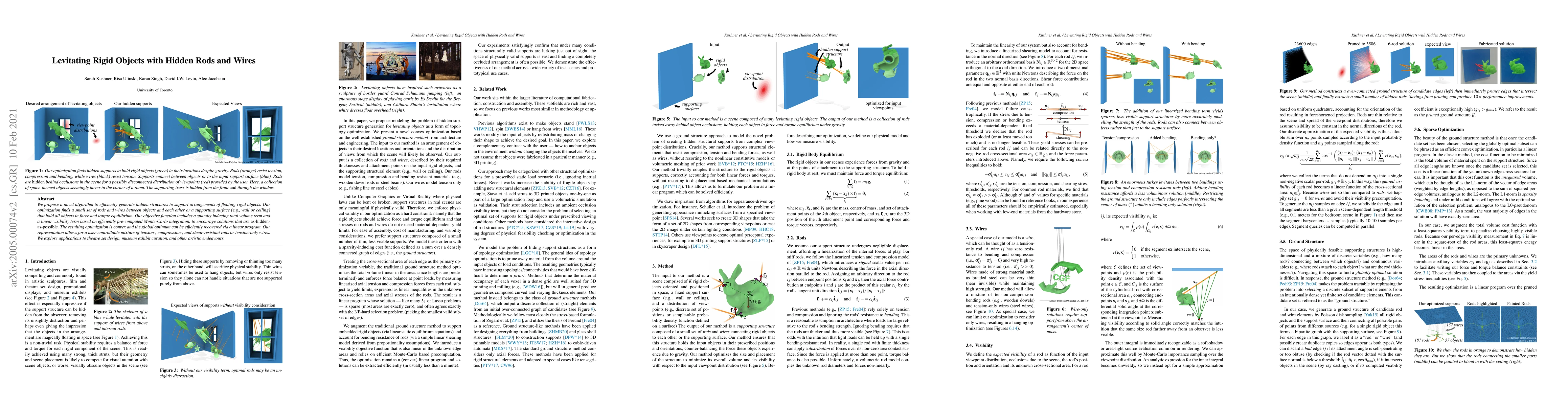 This paper introduces an algorithm for generating minimal hidden structures, like rods and wires, to support floating rigid objects in equilibrium. It uses a convex optimization approach with a focus on minimizing the visible volume and maximizing the hidden nature of the support structures, applicable to artistic fields like theatre and museum design.