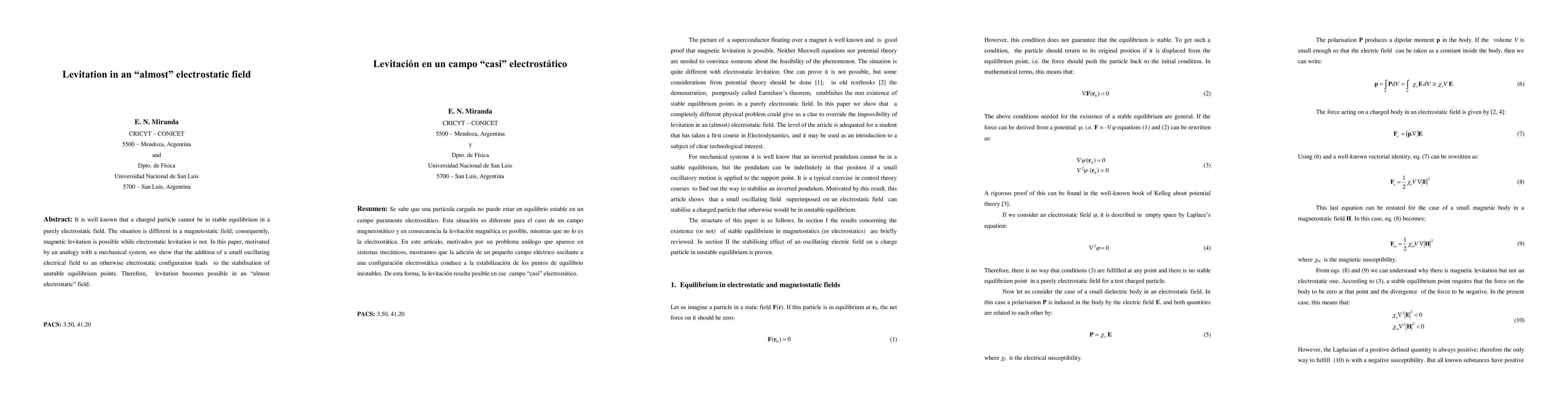 This paper demonstrates that introducing a small oscillating electrical field to an otherwise electrostatic configuration can stabilize unstable equilibrium points, enabling levitation in an "almost" electrostatic field, akin to magnetic levitation.