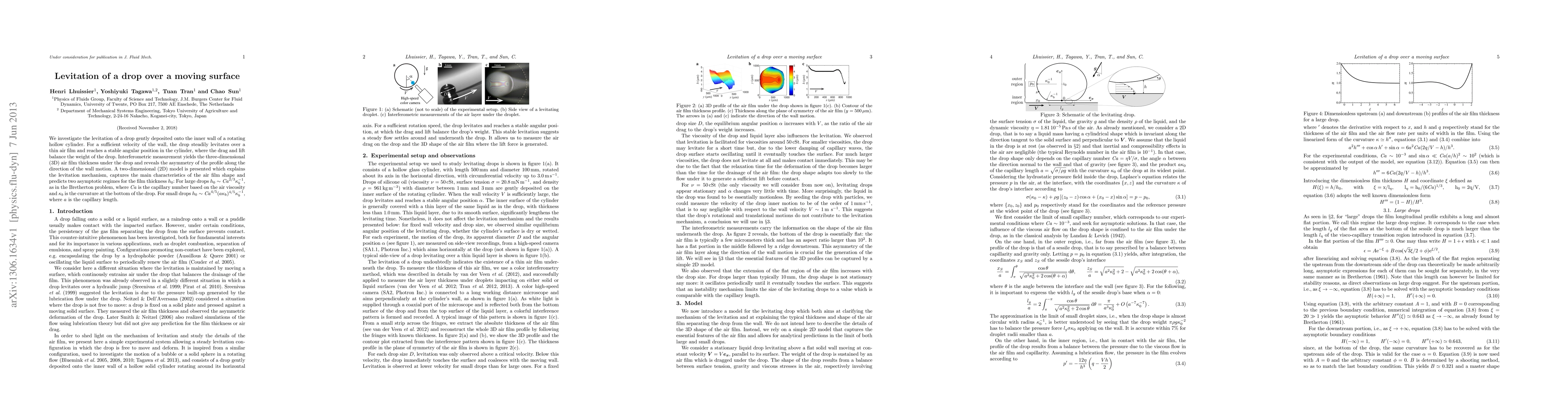 We investigate the levitation of a drop gently deposited onto the inner wall of a rotating hollow cylinder. For a sufficient velocity of the wall, the drop steadily levitates over a thin air film and reaches a stable angular position in the cylinder, where the drag and lift balance the weight of the drop. Interferometric measurement yields the three-dimensional (3D) air film thickness under the drop and reveals the asymmetry of the profile along the direction of the wall motion. A two-dimensional (2D) model is presented which explains the levitation mechanism, captures the main characteristics of the air film shape and predicts two asymptotic regimes for the film thickness $h_0$: For large drops $h_0\sim\ca^{2/3}\kappa_b^{-1}$, as in the Bretherton problem, where $\ca$ is the capillary number based on the air viscosity and $\kappa_b$ is the curvature at the bottom of the drop. For small drops $h_0\sim\ca^{4/5}(a\kappa_b)^{4/5}\kappa_b^{-1}$, where $a$ is the capillary length.
