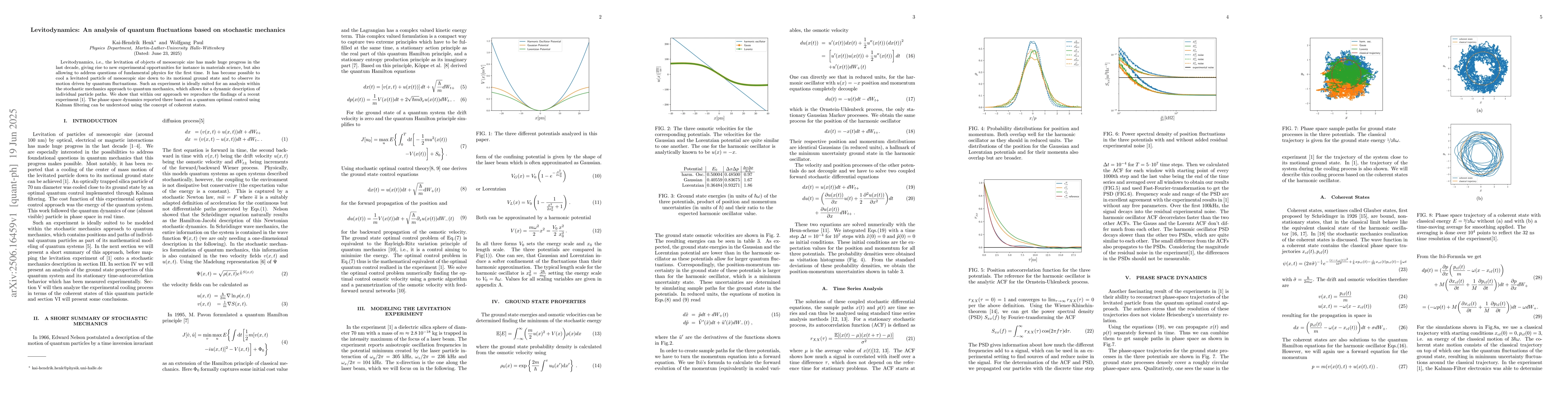Levitodynamics, i.e., the levitation of objects of mesoscopic size has made huge progress in the last decade, giving rise to new experimental opportunities for instance in materials science, but also allowing to address questions of fundamental physics for the first time. It has become possible to cool a levitated particle of mesoscopic size down to its motional ground state and to observe its motion driven by quantum fluctuations. Such an experiment is ideally suited for an analysis within the stochastic mechanics approach to quantum mechanics, which allows for a dynamic description of individual particle paths. We show that within our approach we reproduce the findings of a recent experiment [Magrini et al., Nature 595-373-377 (2021)]. The phase space dynamics reported there based on a quantum optimal control using Kalman filtering can be understood using the concept of coherent states.