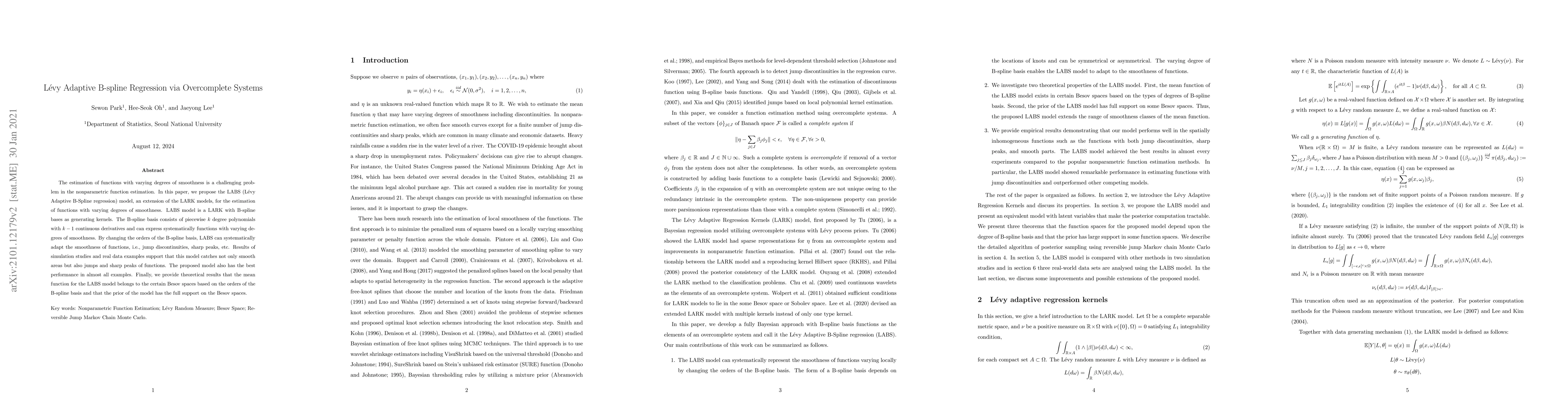 This paper introduces the LABS model, an extension of LARK models using L\'evy Adaptive B-Spline regression, which employs B-spline bases to estimate functions with varying degrees of smoothness. The model adapts to different function characteristics by adjusting the B-spline basis orders, demonstrating superior performance in simulations and real data.