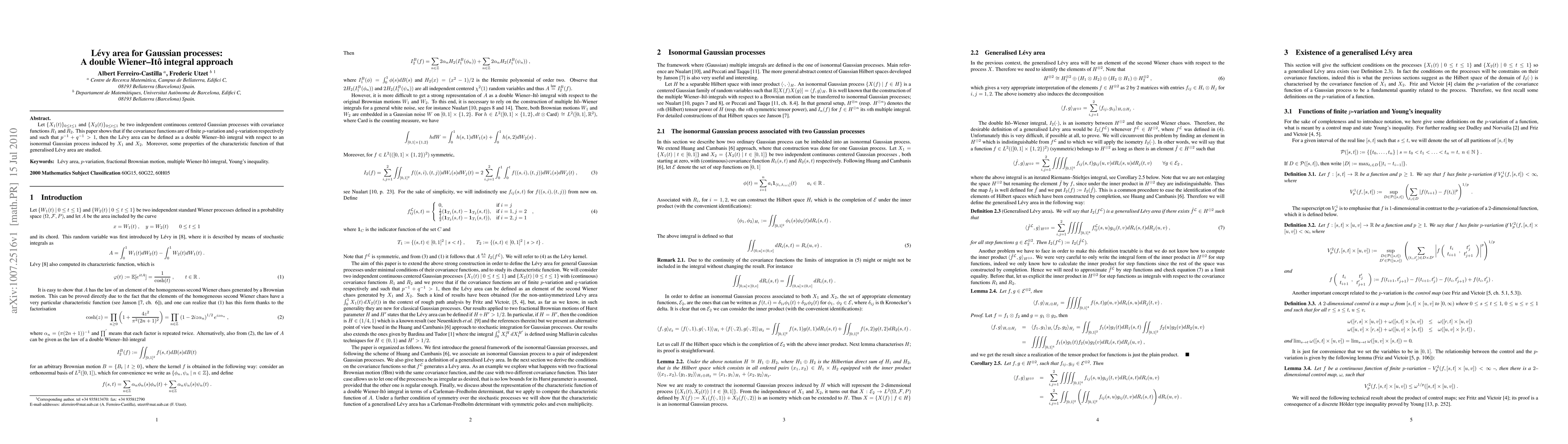 Let $\{X_{1}(t)\}_{0\leq t\leq1}$ and $\{X_{2}(t)\}_{0\leq t\leq1}$ be two independent continuous centered Gaussian processes with covariance functions$R_{1}$ and $R_{2}$. This paper shows that if the covariance functions are of finite $p$-variation and $q$-variation respectively and such that $p^{-1}+q^{-1}>1$,then the L{\'e}vy area can be defined as a double Wiener--It\`o integral with respect to an isonormal Gaussian process induced by $X_{1}$ and $X_{2}$. Moreover, some properties of the characteristic function of that generalised L{\'e}vy area are studied.
