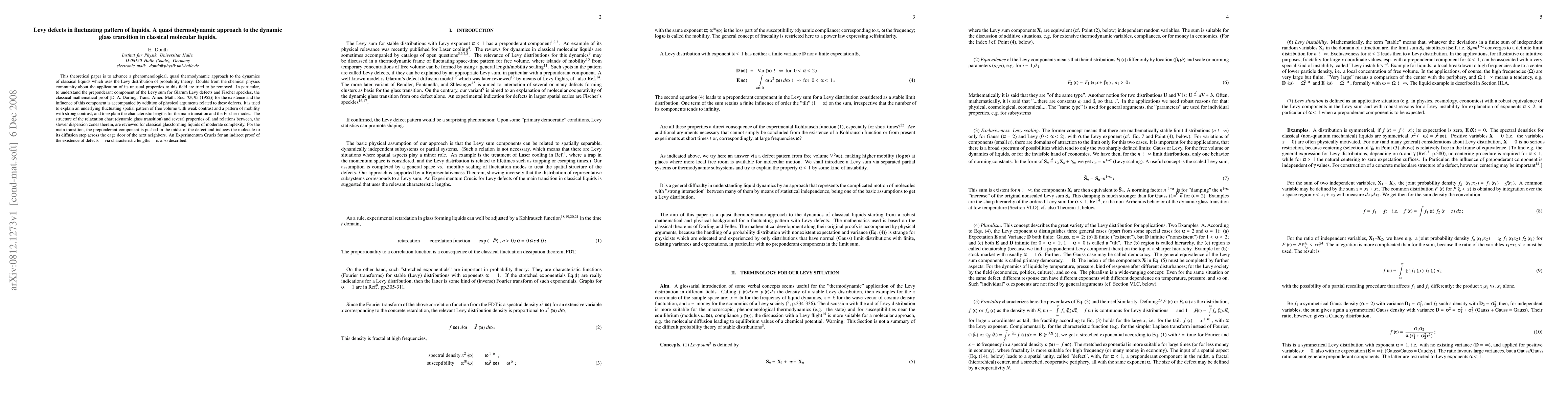 This theoretical paper is to advance a phenomenological, quasi thermodynamic approach to the dynamics of classical liquids which uses the Levy distribution of probability theory. Doubts from the chemical physics community about the application of its unusual properties to this field are tried to be removed. In particular, to understand the preponderant component of the Levy sum for Glarum Levy defects and Fischer speckles, the classical mathematical proof [D. A. Darling, Trans. Amer. Math. Soc. 73, 95 (1952)] for the existence and the influence of this component is accompanied by addition of physical arguments related to these defects. It is tried to explain an underlying fluctuating spatial pattern of free volume with weak contrast and a pattern of mobility with strong contrast, and to explain the characteristic lengths for the main transition and the Fischer modes. The structure of the relaxation chart (dynamic glass transition) and several properties of, and relations between, the slower dispersion zones therein, are reviewed for classical glassforming liquids of moderate complexity. For the main transition, the preponderant component is pushed in the midst of the defect and induces the molecule to its diffusion step across the cage door of the next neighbors. An Experimentum Crucis for an indirect proof of the existence of defects - via characteristic lengths - is also described.
