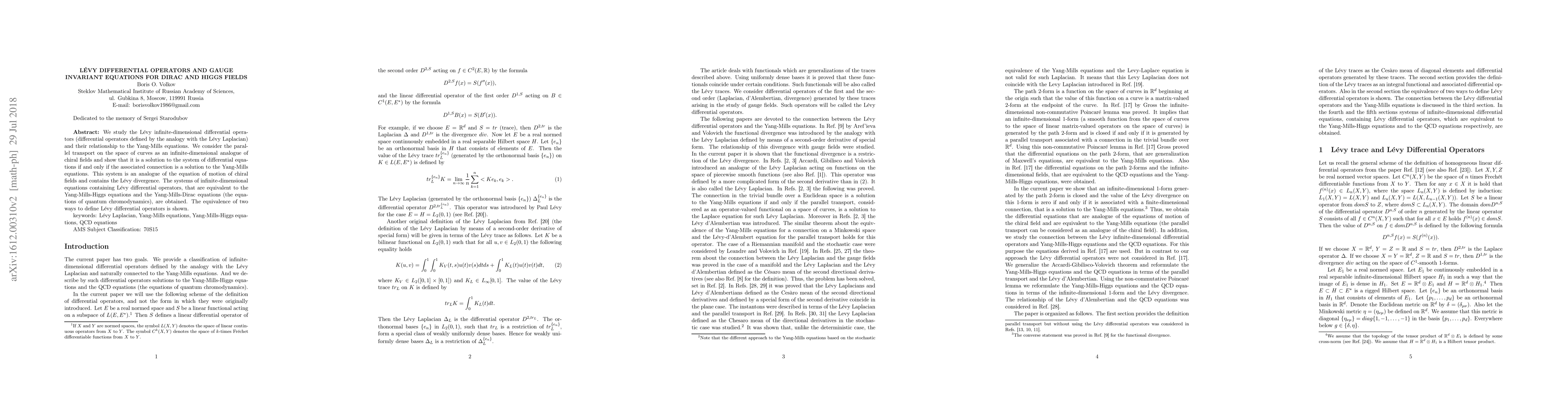 This paper explores Levy infinite-dimensional differential operators and their connection to Yang-Mills equations, demonstrating that parallel transport on curve spaces, analogous to chiral fields, satisfies a system of differential equations if its curvature obeys the Yang-Mills equations. The study also establishes equivalence of these infinite-dimensional systems with the Yang-Mills-Higgs and Yang-Mills-Dirac equations.