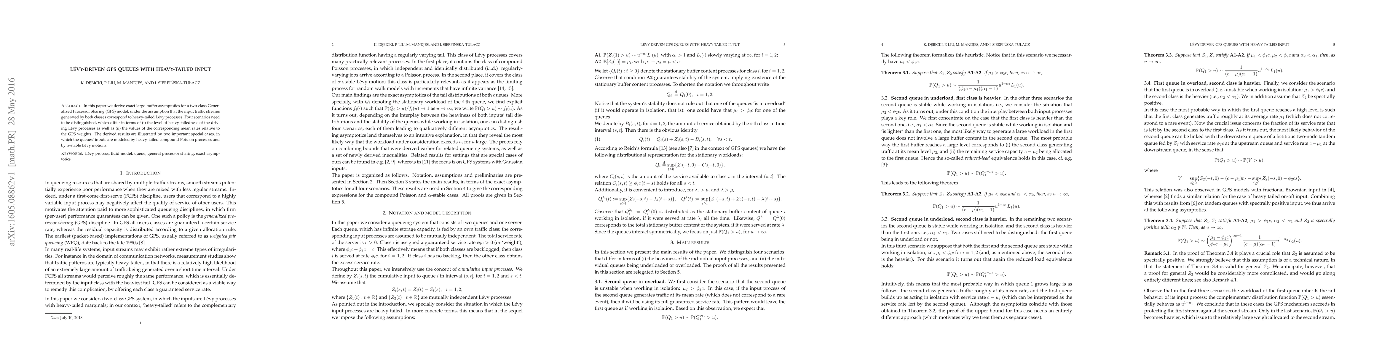 The paper presents detailed derivations and proofs for the large-buffer asymptotics of GPS queues driven by heavy-tailed Lévy processes, including specific cases of compound Poisson and α-stable Lévy motions.