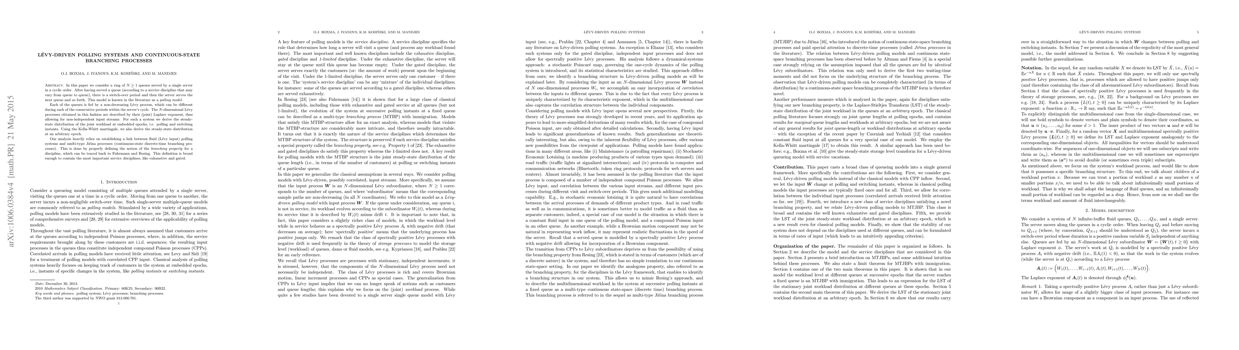 This paper studies a cyclic polling system with $N$ queues, each driven by a distinct non-decreasing Lévy process. The authors derive the steady-state distribution of joint workload at polling and switching instants, establishing a connection between Lévy-driven polling systems and multi-type Jiřína processes through a defined branching property.