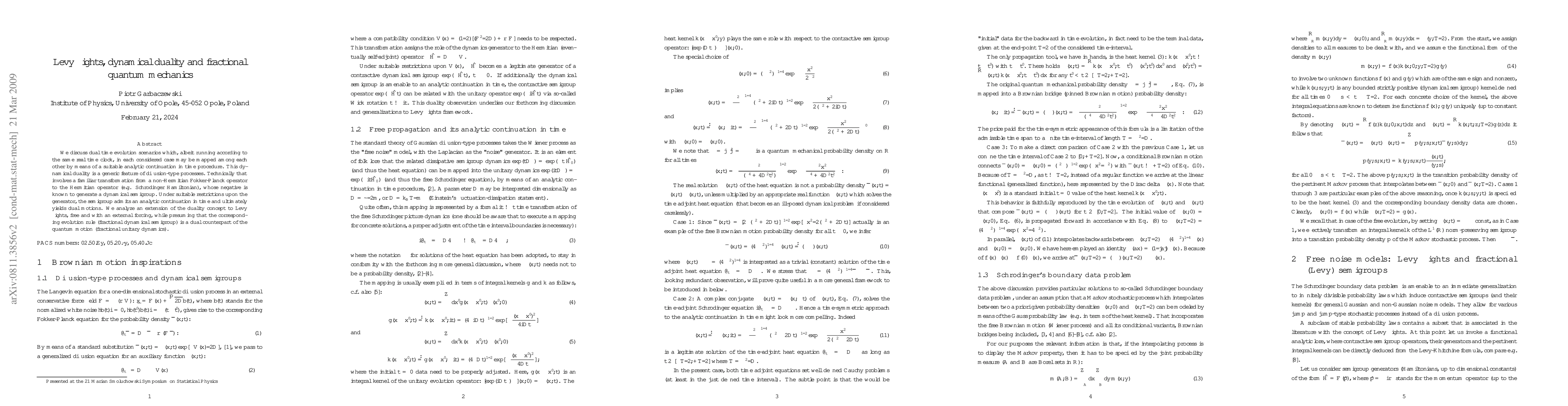 We discuss dual time evolution scenarios which, albeit running according to the same real time clock, in each considered case may be mapped among each other by means of an analytic continuation in time. This dynamical duality is a generic feature of diffusion-type processes. Technically that involves a familiar transformation from a non-Hermitian Fokker-Planck operator to the Hermitian operator (e.g. Schroedinger Hamiltonian), whose negative is known to generate a dynamical semigroup. Under suitable restrictions upon the generator, the semigroup admits an analytic continuation in time and ultimately yields dual motions. We analyze an extension of the duality concept to Levy flights, free and with an external forcing, while presuming that the corresponding evolution rule (fractional dynamical semigroup) is a dual counterpart of the quantum motion (fractional unitary dynamics).