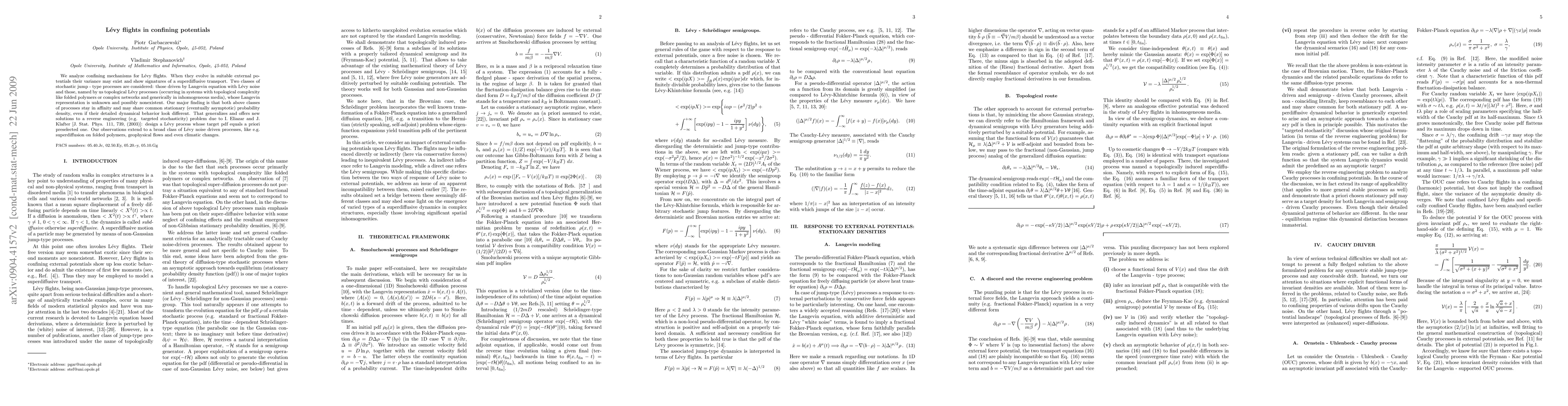 We analyze confining mechanisms for L\'{e}vy flights. When they evolve in suitable external potentials their variance may exist and show signatures of a superdiffusive transport. Two classes of stochastic jump - type processes are considered: those driven by Langevin equation with L\'{e}vy noise and those, named by us topological L\'{e}vy processes (occurring in systems with topological complexity like folded polymers or complex networks and generically in inhomogeneous media), whose Langevin representation is unknown and possibly nonexistent. Our major finding is that both above classes of processes stay in affinity and may share common stationary (eventually asymptotic) probability density, even if their detailed dynamical behavior look different. That generalizes and offers new solutions to a reverse engineering (e.g. targeted stochasticity) problem due to I. Eliazar and J. Klafter [J. Stat. Phys. 111, 739, (2003)]: design a L\'{e}vy process whose target pdf equals a priori preselected one. Our observations extend to a broad class of L\'{e}vy noise driven processes, like e.g. superdiffusion on folded polymers, geophysical flows and even climatic changes.