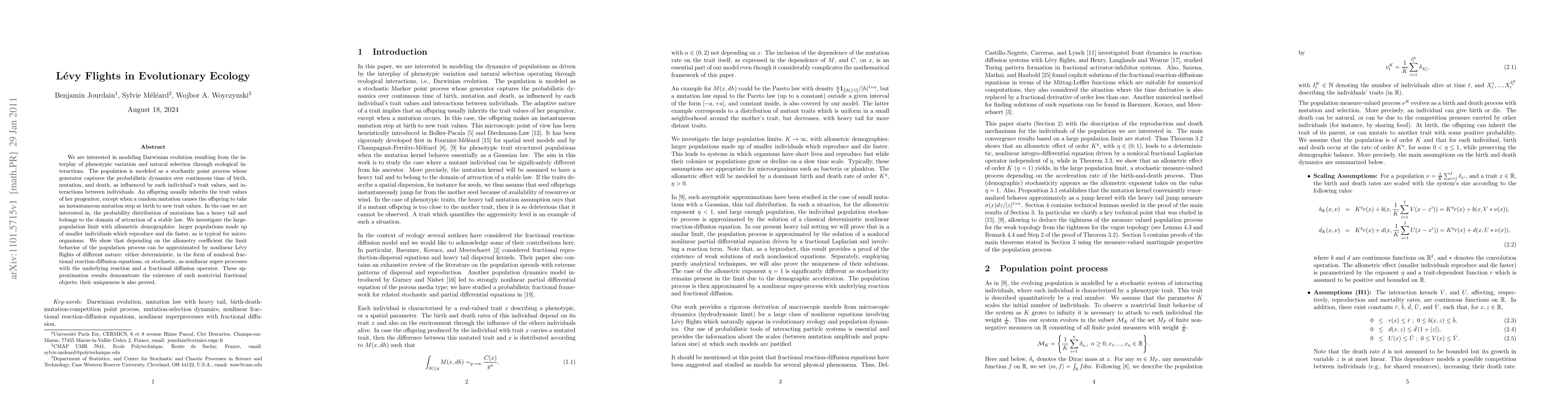 We are interested in modeling Darwinian evolution resulting from the interplay of phenotypic variation and natural selection through ecological interactions. The population is modeled as a stochastic point process whose generator captures the probabilistic dynamics over continuous time of birth, mutation, and death, as influenced by each individual's trait values, and interactions between individuals. An offspring usually inherits the trait values of her progenitor, except when a random mutation causes the offspring to take an instantaneous mutation step at birth to new trait values. In the case we are interested in, the probability distribution of mutations has a heavy tail and belongs to the domain of attraction of a stable law. We investigate the large-population limit with allometric demographies: larger populations made up of smaller individuals which reproduce and die faster, as is typical for micro-organisms. We show that depending on the allometry coefficient the limit behavior of the population process can be approximated by nonlinear L\'evy flights of different nature: either deterministic, in the form of nonlocal fractional reaction-diffusion equations, or stochastic, as nonlinear super-processes with the underlying reaction and a fractional diffusion operator. These approximation results demonstrate the existence of such nontrivial fractional objects; their uniqueness is also proved.