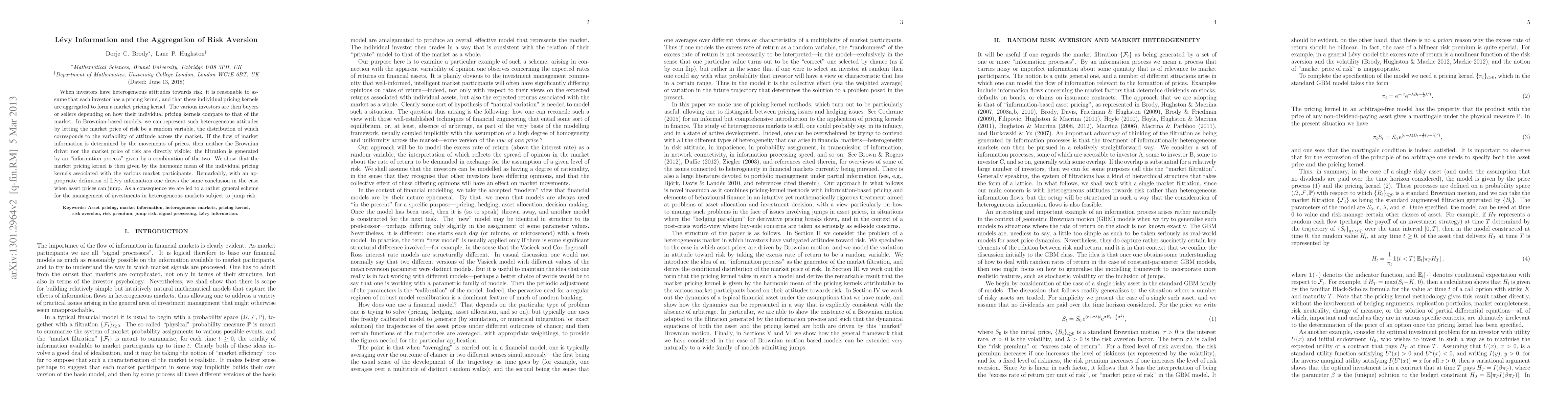 When investors have heterogeneous attitudes towards risk, it is reasonable to assume that each investor has a pricing kernel, and that these individual pricing kernels are aggregated to form a market pricing kernel. The various investors are then buyers or sellers depending on how their individual pricing kernels compare to that of the market. In Brownian-based models, we can represent such heterogeneous attitudes by letting the market price of risk be a random variable, the distribution of which corresponds to the variability of attitude across the market. If the flow of market information is determined by the movements of prices, then neither the Brownian driver nor the market price of risk are directly visible: the filtration is generated by an "information process" given by a combination of the two. We show that the market pricing kernel is then given by the harmonic mean of the individual pricing kernels associated with the various market participants. Remarkably, with an appropriate definition of L\'evy information one draws the same conclusion in the case when asset prices can jump. As a consequence we are led to a rather general scheme for the management of investments in heterogeneous markets subject to jump risk.