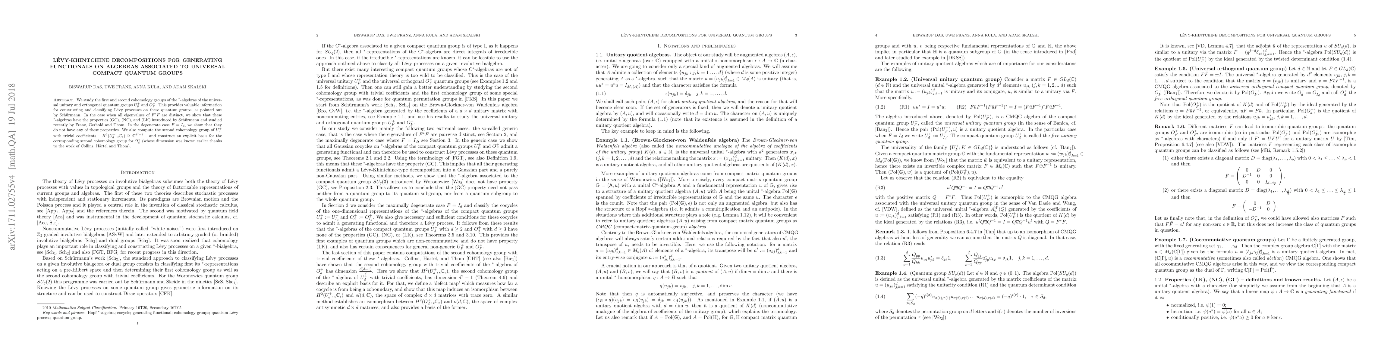We study the first and second cohomology groups of the $^*$-algebras of the universal unitary and orthogonal quantum groups $U_F^+$ and $O_F^+$. This provides valuable information for constructing and classifying L\'evy processes on these quantum groups, as pointed out by Sch\"urmann. In the case when all eigenvalues of $F^*F$ are distinct, we show that these $^*$-algebras have the properties (GC), (NC), and (LK) introduced by Sch\"urmann and studied recently by Franz, Gerhold and Thom. In the degenerate case $F=I_d$, we show that they do not have any of these properties. We also compute the second cohomology group of $U_d^+$ with trivial coefficients -- $H^2(U_d^+,{}_\epsilon\Bbb{C}_\epsilon)\cong \Bbb{C}^{d^2-1}$ -- and construct an explicit basis for the corresponding second cohomology group for $O_d^+$ (whose dimension was known earlier thanks to the work of Collins, H\"artel and Thom).