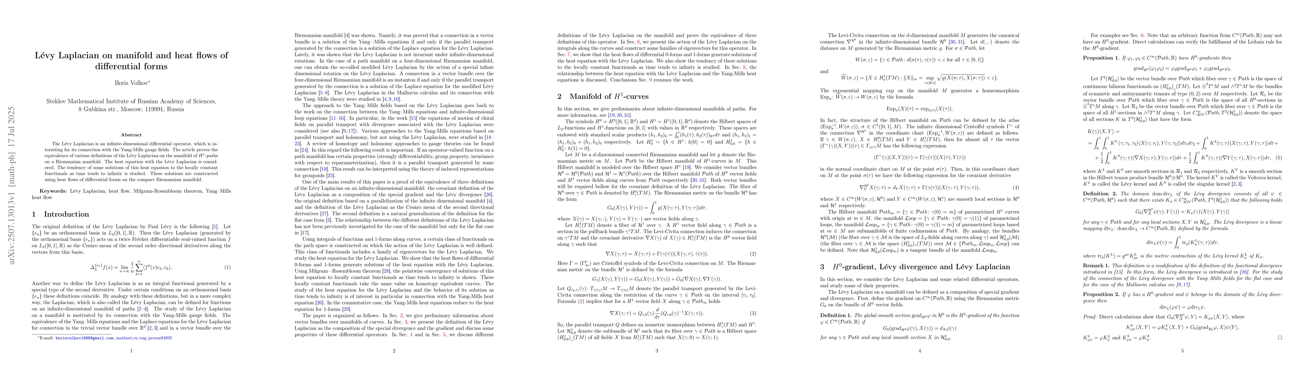 The Levy Laplacian is an infinite-dimensional differential operator, which is interesting for its connection with the Yang-Mills gauge fields. The article proves the equivalence of various definitions of the Levy Laplacian on the manifold of $H^1$-paths on a Riemannian manifold. The heat equation with the Levy Laplacian is considered. The tendency of some solutions of this heat equation to the locally constant functionals as time tends to infinity is studied. These solutions are constructed using heat flows of differential forms on the compact Riemannian manifold.