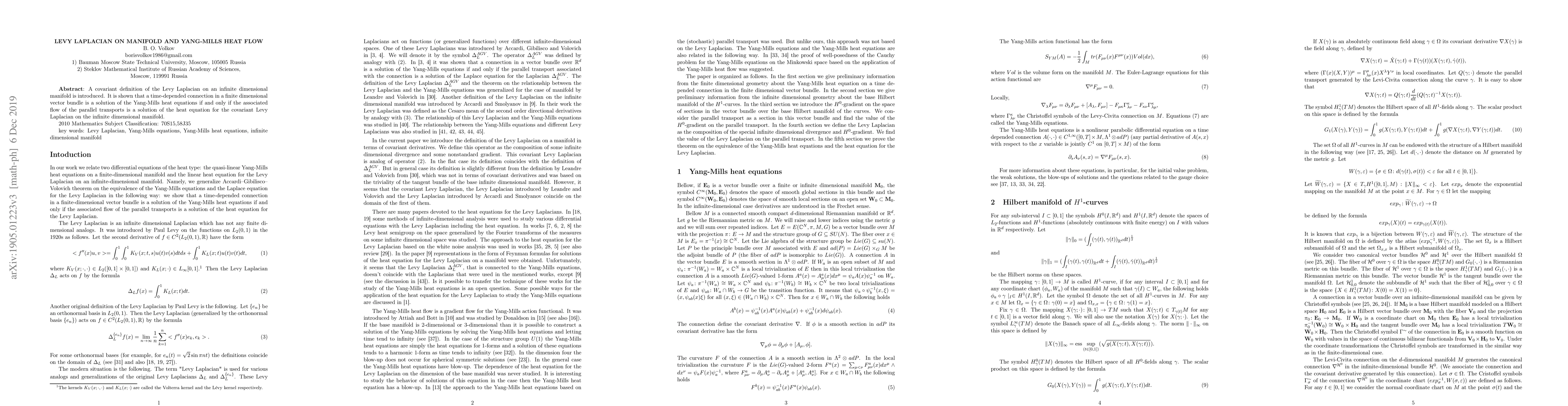 This paper introduces a covariant definition of the Levy Laplacian on infinite-dimensional manifolds and demonstrates that a time-dependent connection in a finite-dimensional vector bundle solves the Yang-Mills heat equations if and only if the associated parallel transport flow solves the heat equation for the covariant Levy Laplacian.