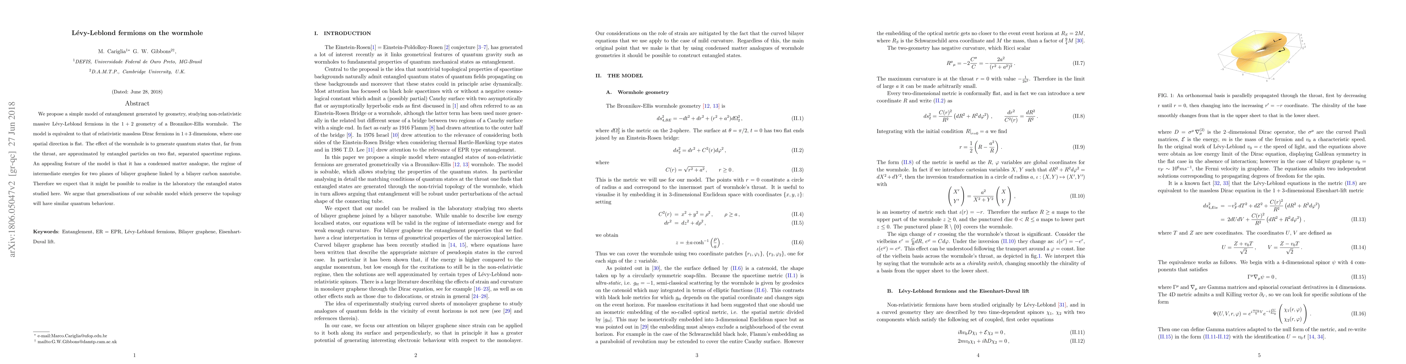 We propose a simple model of entanglement generated by geometry, studying non-relativistic massive L\'evy-Leblond fermions in the $1+2$ geometry of a Bronnikov-Ellis wormhole. The model is equivalent to that of relativistic massless Dirac fermions in $1+3$ dimensions, where one spatial direction is flat. The effect of the wormhole is to generate quantum states that, far from the throat, are approximated by entangled particles on two flat, separated spacetime regions. An appealing feature of the model is that it has a condensed matter analogue, the regime of intermediate energies for two planes of bilayer graphene linked by a bilayer carbon nanotube. Therefore we expect that it might be possible to realize in the laboratory the entangled states studied here. We argue that generalisations of our solvable model which preserve the topology will have similar quantum behaviour.