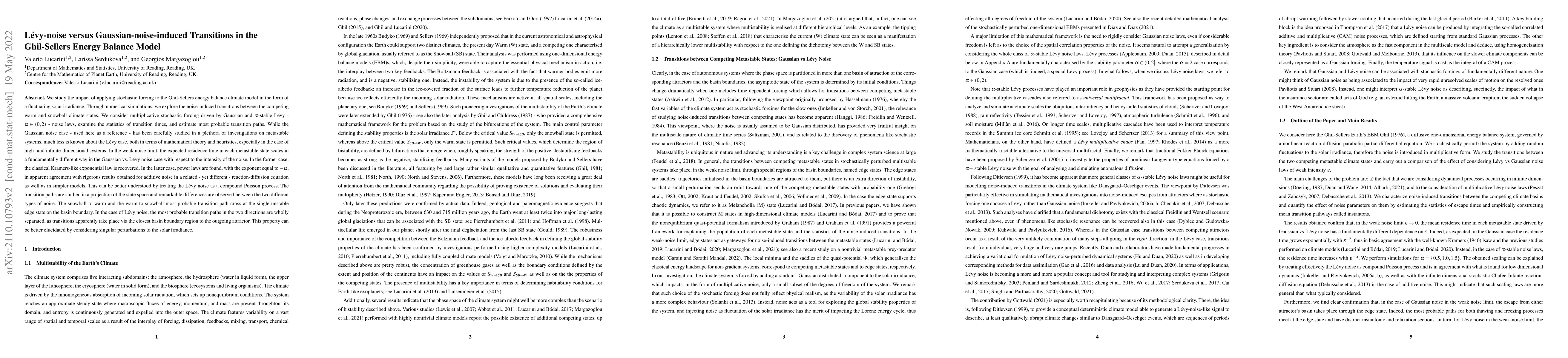 We study the impact of applying stochastic forcing to the Ghil-Sellers energy balance climate model in the form of a fluctuating solar irradiance. Through numerical simulations, we explore the noise-induced transitions between the competing warm and snowball climate states. We consider multiplicative stochastic forcing driven by Gaussian and $\alpha$-stable L\'evy - $\alpha\in(0,2)$ - noise laws, examine the statistics of transition times, and estimate most probable transition paths. While the Gaussian noise case has been carefully studied in a plethora of investigations on metastable systems, much less is known about the L\'evy case, especially in the case of high- and infinite-dimensional systems. In the weak noise limit, the expected residence time in each metastable state scales in a fundamentally different way in the Gaussian vs. L\'evy noise case with respect to the intensity of the noise. In the former case, the classical Kramers-like exponential law is recovered. In the latter case, power laws are found, with the exponent equal to $-\alpha$, in apparent agreement with rigorous results obtained for additive noise in a related - yet different - reaction-diffusion equation as well as in simpler models. This can be better understood by treating the L\'evy noise as a compound Poisson process. The transition paths are studied in a projection of the state space and remarkable differences are observed between the two different types of noise. The snowball-to-warm and the warm-to-snowball most probable transition path cross at the single unstable edge state on the basin boundary. In the case of L\'evy noise, the most probable transition paths in the two directions are wholly separated, as transitions apparently take place via the closest basin boundary region to the outgoing attractor. This property can be better elucidated by considering singular perturbations to the solar irradiance.