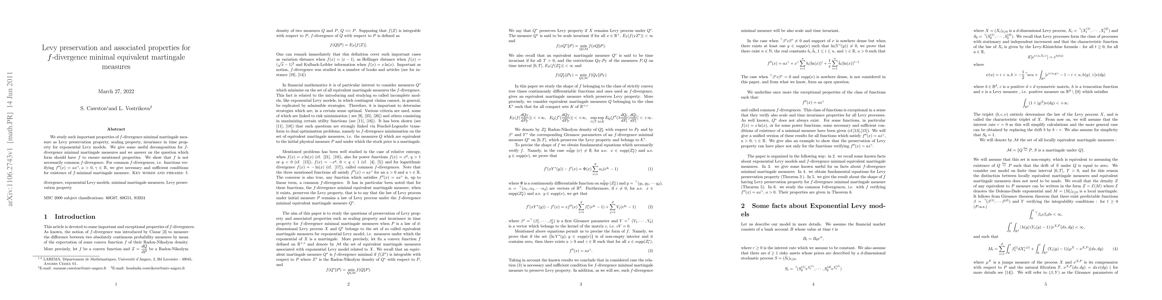 This paper investigates the properties of $f$-divergence minimal martingale measures, focusing on the Levy preservation, scaling, and time invariance properties. It provides a decomposition for these measures and determines the conditions under which $f$ must be structured to ensure these properties, noting that $f$ does not have to be a common $f$-divergence.