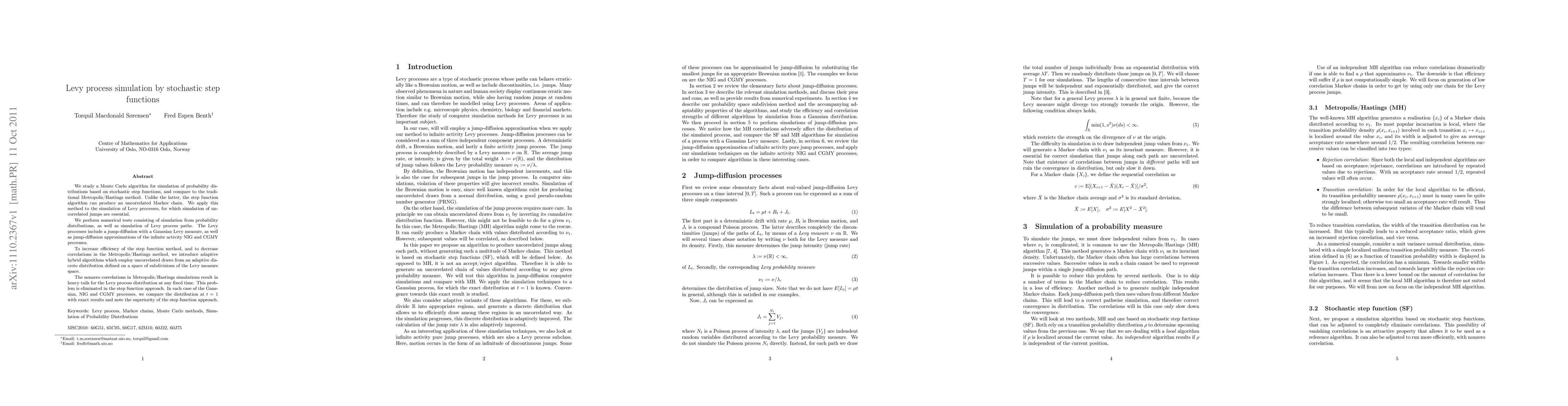 This paper proposes a Monte Carlo algorithm based on stochastic step functions for simulating Levy processes, which produces an uncorrelated Markov chain. The step function method is shown to outperform the traditional Metropolis/Hastings method, especially in eliminating heavy tails in the simulated distributions, as demonstrated through simulations of Gaussian, NIG, and CGMY processes.