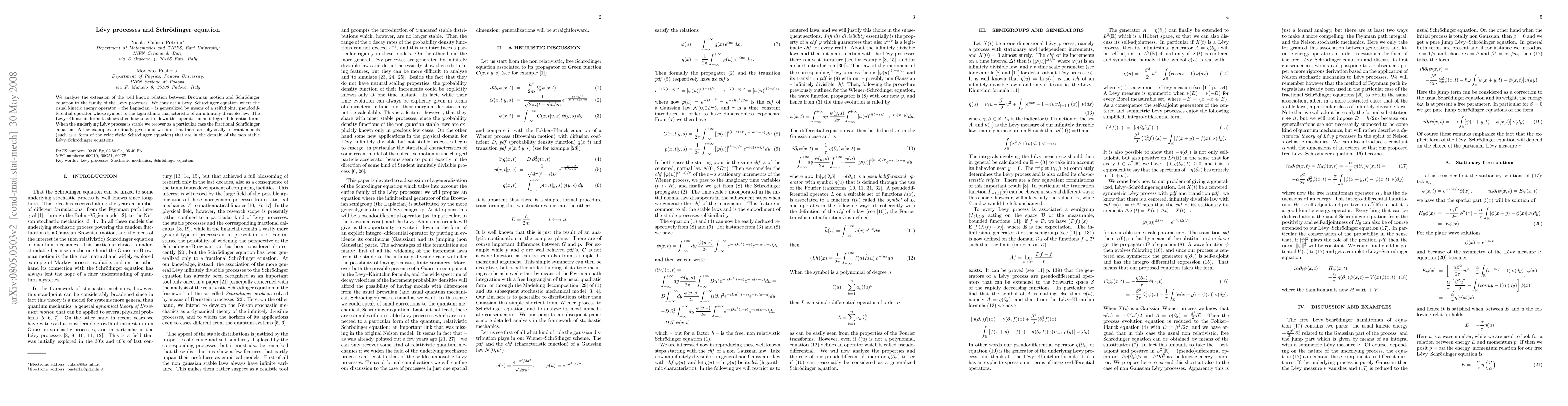 We analyze the extension of the well known relation between Brownian motion and Schroedinger equation to the family of Levy processes. We consider a Levy-Schroedinger equation where the usual kinetic energy operator - the Laplacian - is generalized by means of a selfadjoint, pseudodifferential operator whose symbol is the logarithmic characteristic of an infinitely divisible law. The Levy-Khintchin formula shows then how to write down this operator in an integro--differential form. When the underlying Levy process is stable we recover as a particular case the fractional Schroedinger equation. A few examples are finally given and we find that there are physically relevant models (such as a form of the relativistic Schroedinger equation) that are in the domain of the non-stable, Levy-Schroedinger equations.