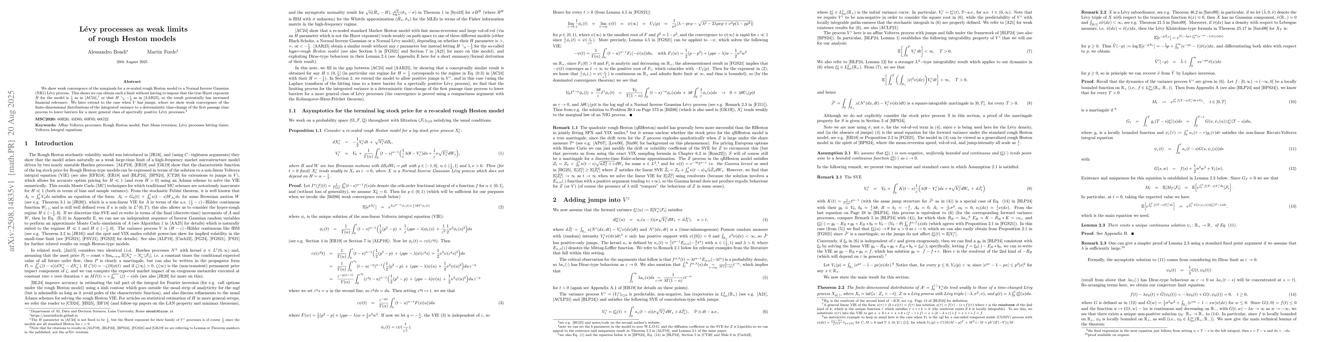 The research establishes weak convergence of a re-scaled rough Heston model to a Normal Inverse Gaussian (NIG) Lévy process, extending to the case when V has jumps, showing weak convergence of the integrated variance to a deterministic time-change of the first passage time process to lower barriers for a more general class of spectrally positive Lévy processes.
