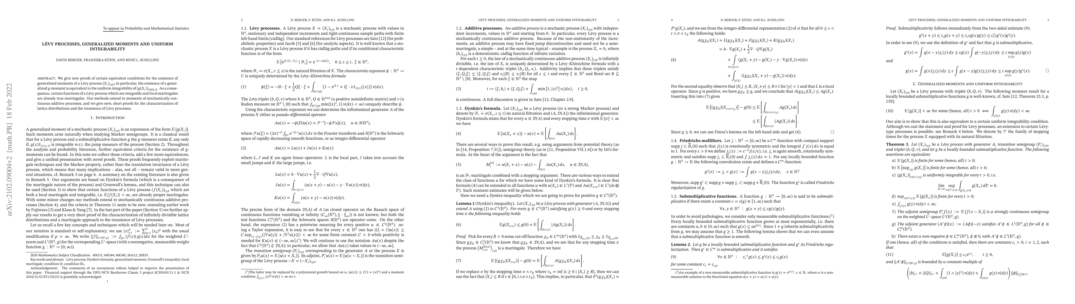 This paper provides new proofs for the equivalence between the existence of generalized moments in Lévy processes and their uniform integrability, leading to the identification of certain integrable local martingales as true martingales. The methods also extend to stochastically continuous additive processes and offer concise proofs for lattice distributions and Lévy process transience.