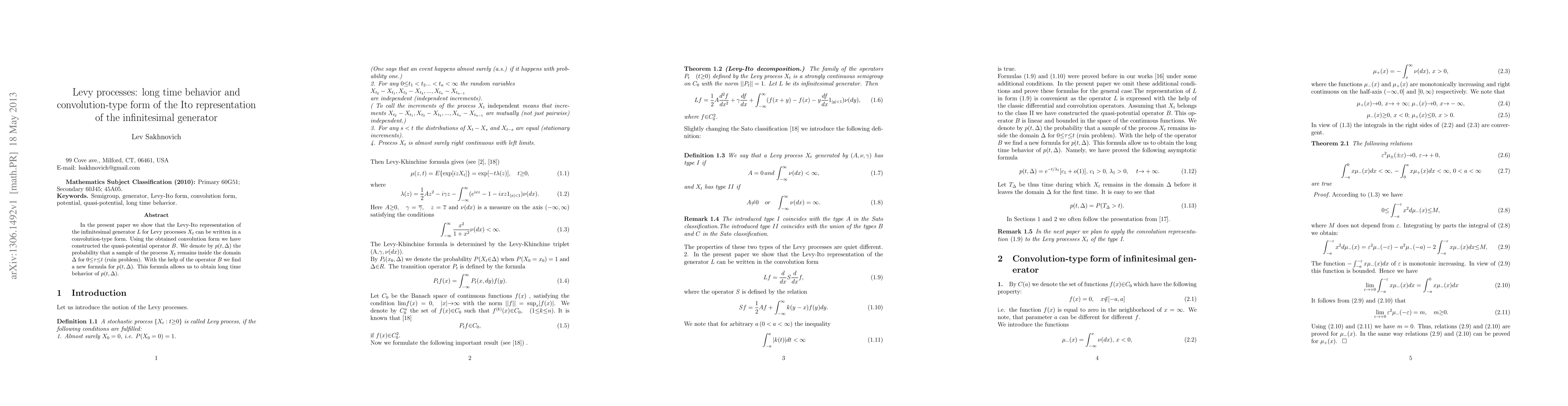 This paper demonstrates a convolution-type form for the Levy-Ito representation of the infinitesimal generator $L$ for Levy processes $X_t$. It constructs a quasi-potential operator $B$ and uses it to derive a new formula for the probability $p(t,\Delta)$, revealing the long-time behavior of $p(t,\Delta)$.