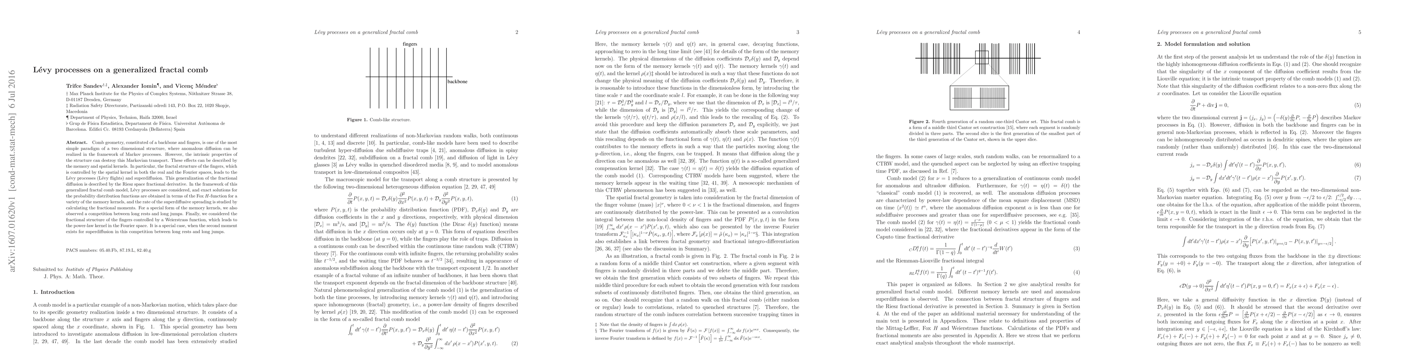 Comb geometry, constituted of a backbone and fingers, is one of the most simple paradigm of a two dimensional structure, where anomalous diffusion can be realized in the framework of Markov processes. However, the intrinsic properties of the structure can destroy this Markovian transport. These effects can be described by the memory and spatial kernels. In particular, the fractal structure of the fingers, which is controlled by the spatial kernel in both the real and the Fourier spaces, leads to the L\'evy processes (L\'evy flights) and superdiffusion. This generalization of the fractional diffusion is described by the Riesz space fractional derivative. In the framework of this generalized fractal comb model, L\'evy processes are considered, and exact solutions for the probability distribution functions are obtained in terms of the Fox $H$-function for a variety of the memory kernels, and the rate of the superdiffusive spreading is studied by calculating the fractional moments. For a special form of the memory kernels, we also observed a competition between long rests and long jumps. Finally, we considered the fractional structure of the fingers controlled by a Weierstrass function, which leads to the power-law kernel in the Fourier space. It is a special case, when the second moment exists for superdiffusion in this competition between long rests and long jumps.