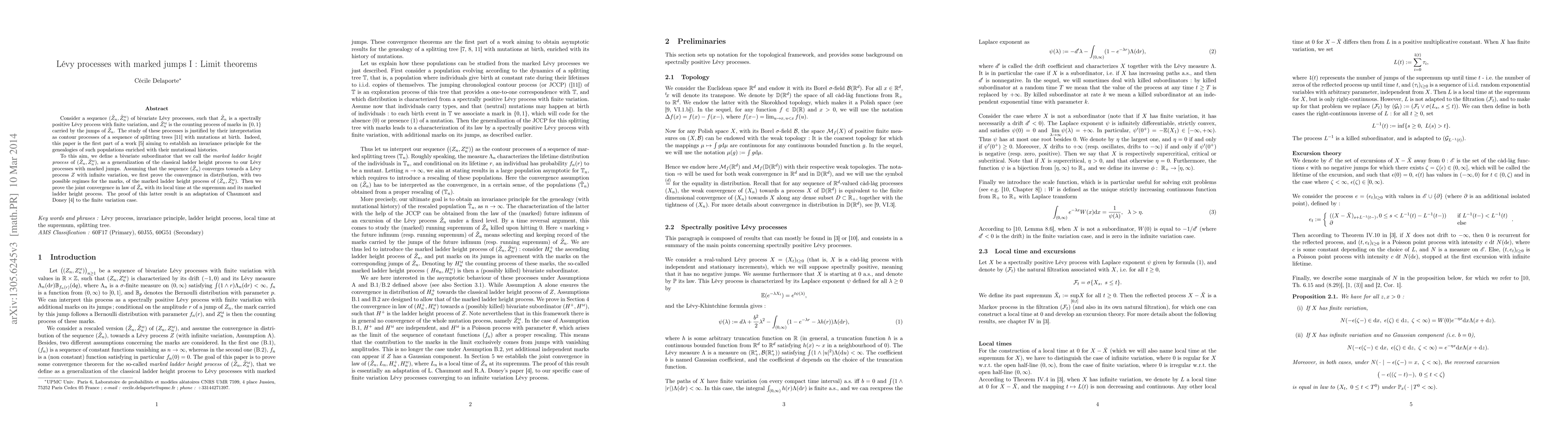 Consider a sequence (Z_n,Z_n^M) of bivariate L\'evy processes, such that Z_n is a spectrally positive L\'evy process with finite variation, and Z_n^M is the counting process of marks in {0,1} carried by the jumps of Z_n. The study of these processes is justified by their interpretation as contour processes of a sequence of splitting trees with mutations at birth. Indeed, this paper is the first part of a work aiming to establish an invariance principle for the genealogies of such populations enriched with their mutational histories. To this aim, we define a bivariate subordinator that we call the marked ladder height process of (Z_n,Z_n^M), as a generalization of the classical ladder height process to our L\'evy processes with marked jumps. Assuming that the sequence (Z_n) converges towards a L\'evy process Z with infinite variation, we first prove the convergence in distribution, with two possible regimes for the marks, of the marked ladder height process of (Z_n,Z_n^M). Then we prove the joint convergence in law of Z_n with its local time at the supremum and its marked ladder height process.