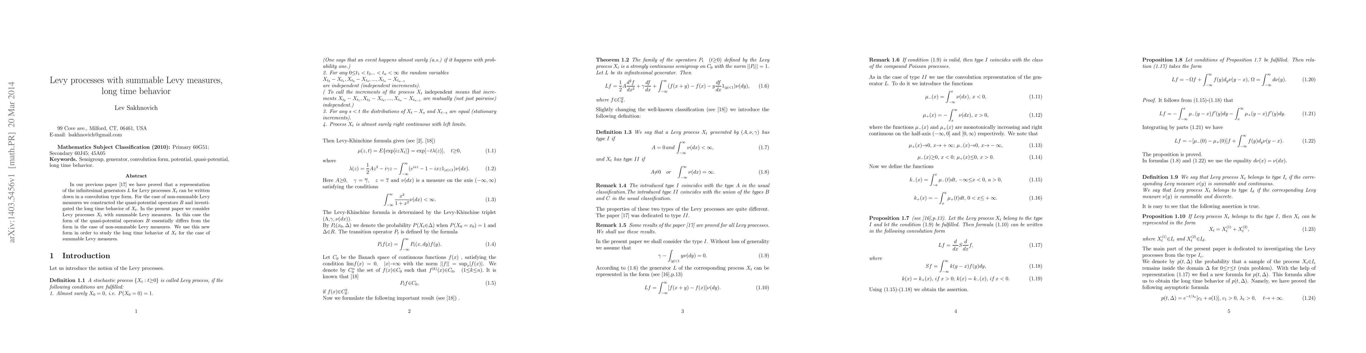 This paper investigates the long time behavior of Levy processes $X_t$ with summable Levy measures, where the quasi-potential operators $B$ have a distinct form compared to those with non-summable measures. It leverages this new form to analyze the long time dynamics of such processes.