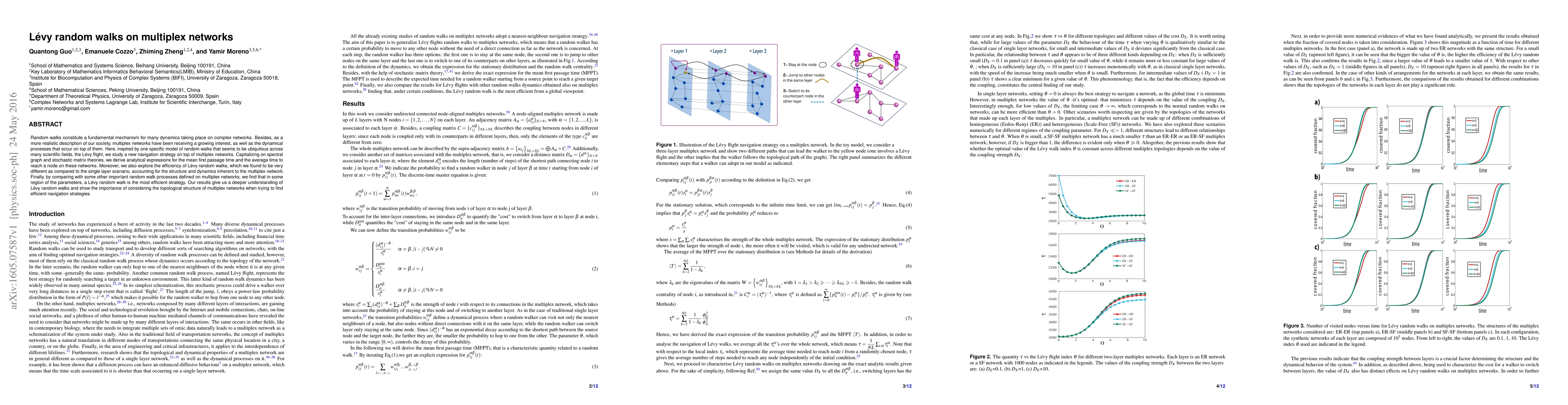 Random walks constitute a fundamental mechanism for many dynamics taking place on complex networks. Besides, as a more realistic description of our society, multiplex networks have been receiving a growing interest, as well as the dynamical processes that occur on top of them. Here, inspired by one specific model of random walks that seems to be ubiquitous across many scientific fields, the Levy flight, we study a new navigation strategy on top of multiplex networks. Capitalizing on spectral graph and stochastic matrix theories, we derive analytical expressions for the mean first passage time and the average time to reach a node on these networks. Moreover, we also explore the efficiency of Levy random walks, which we found to be very different as compared to the single layer scenario, accounting for the structure and dynamics inherent to the multiplex network. Finally, by comparing with some other important random walk processes defined on multiplex networks, we find that in some region of the parameters, a Levy random walk is the most efficient strategy. Our results give us a deeper understanding of Levy random walks and show the importance of considering the topological structure of multiplex networks when trying to find efficient navigation strategies.
