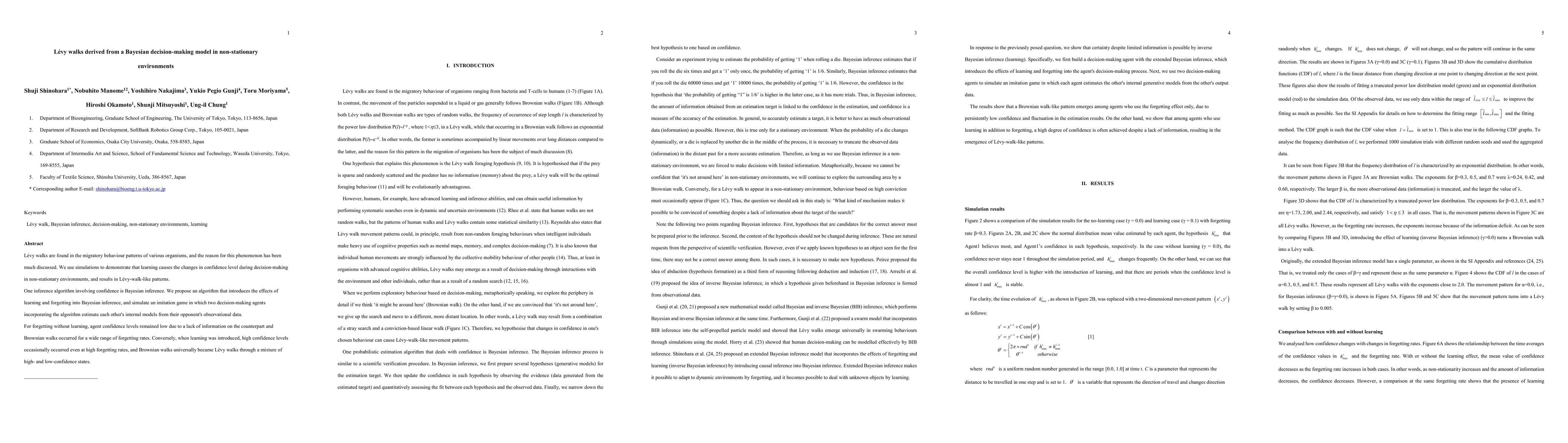 L\'evy walks are found in the migratory behaviour patterns of various organisms, and the reason for this phenomenon has been much discussed. We use simulations to demonstrate that learning causes the changes in confidence level during decision-making in non-stationary environments, and results in L\'evy-walk-like patterns. One inference algorithm involving confidence is Bayesian inference. We propose an algorithm that introduces the effects of learning and forgetting into Bayesian inference, and simulate an imitation game in which two decision-making agents incorporating the algorithm estimate each other's internal models from their opponent's observational data. For forgetting without learning, agent confidence levels remained low due to a lack of information on the counterpart and Brownian walks occurred for a wide range of forgetting rates. Conversely, when learning was introduced, high confidence levels occasionally occurred even at high forgetting rates, and Brownian walks universally became L\'evy walks through a mixture of high- and low-confidence states.