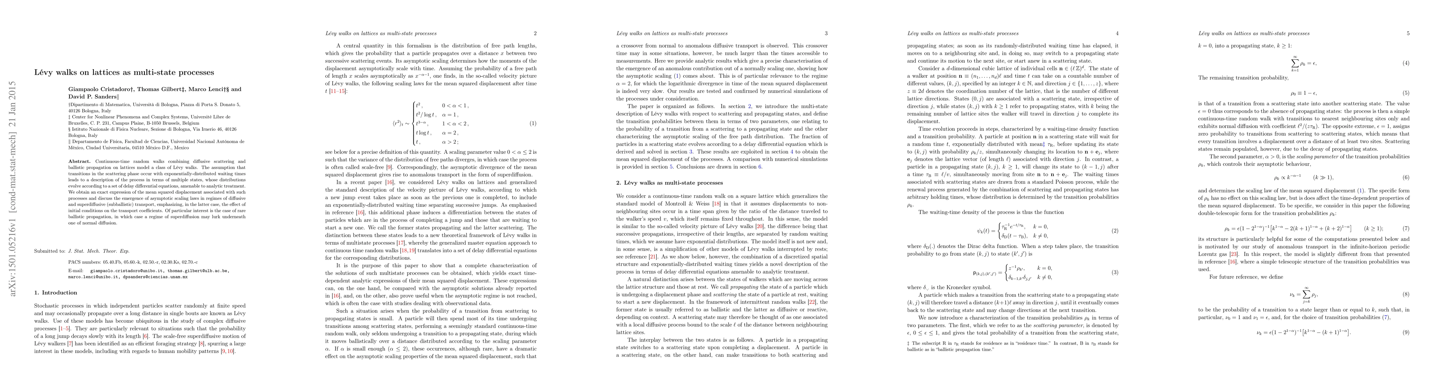 This paper models L\'evy walks on lattices as multi-state processes using continuous-time random walks, deriving exact mean squared displacement expressions and delay differential equations. It explores diffusive and superdiffusive transport regimes, highlighting the impact of initial conditions on transport coefficients, especially in rare ballistic propagation scenarios.