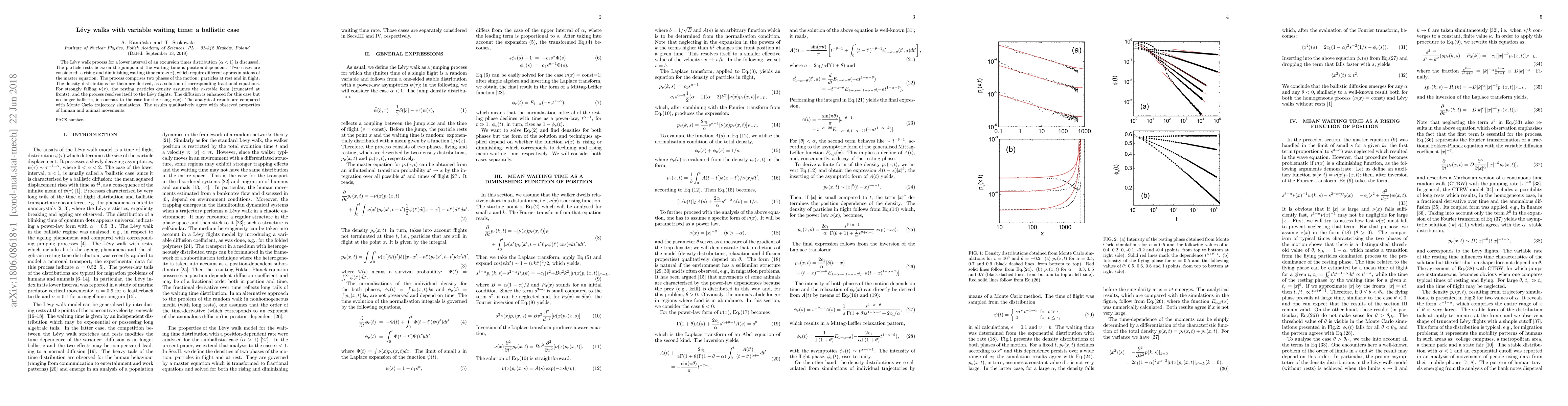 The L\'evy walk process for a lower interval of an excursion times distribution ($\alpha<1$) is discussed. The particle rests between the jumps and the waiting time is position-dependent. Two cases are considered: a rising and diminishing waiting time rate $\nu(x)$, which require different approximations of the master equation. The process comprises two phases of the motion: particles at rest and in flight. The density distributions for them are derived, as a solution of corresponding fractional equations. For strongly falling $\nu(x)$, the resting particles density assumes the $\alpha$-stable form (truncated at fronts), and the process resolves itself to the L\'evy flights. The diffusion is enhanced for this case but no longer ballistic, in contrast to the case for the rising $\nu(x)$. The analytical results are compared with Monte Carlo trajectory simulations. The results qualitatively agree with observed properties of human and animal movements.