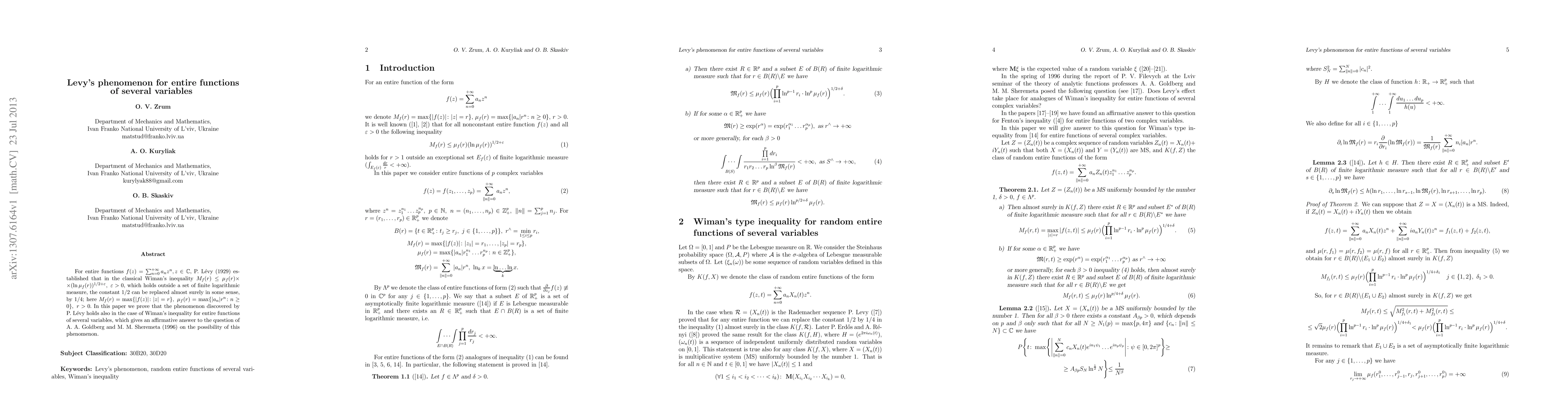This paper extends P.L{ m ext{e}}vy's 1929 result to entire functions of several variables, proving a phenomenon that implies Wiman's inequality holds for such functions.