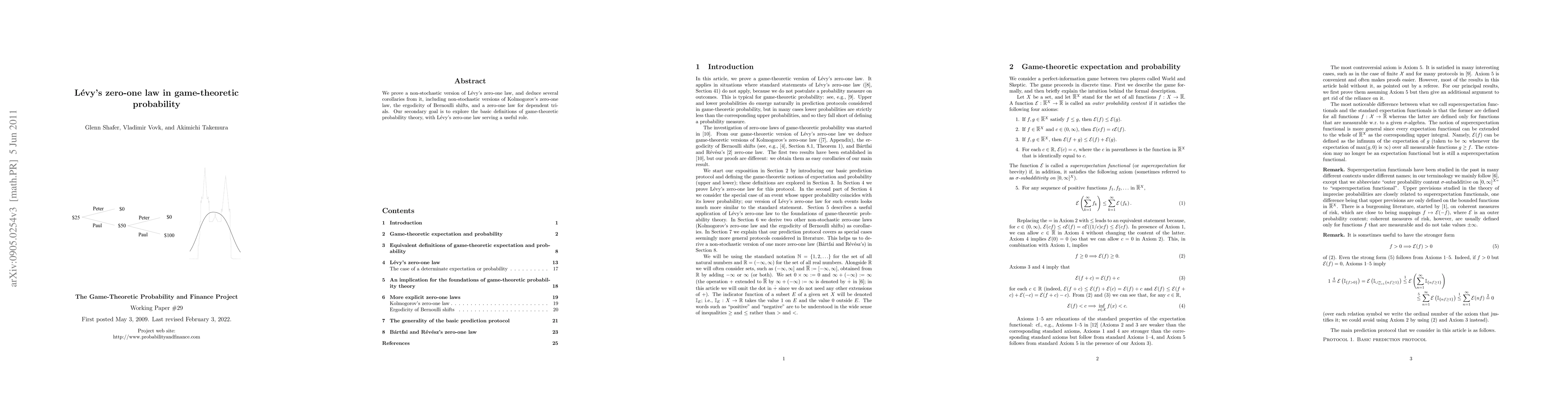 This paper proves a game-theoretic version of Levy's zero-one law and derives several corollaries, including non-stochastic versions of Kolmogorov's zero-one law and the ergodicity of Bernoulli shifts. It also explores foundational definitions in game-theoretic probability.