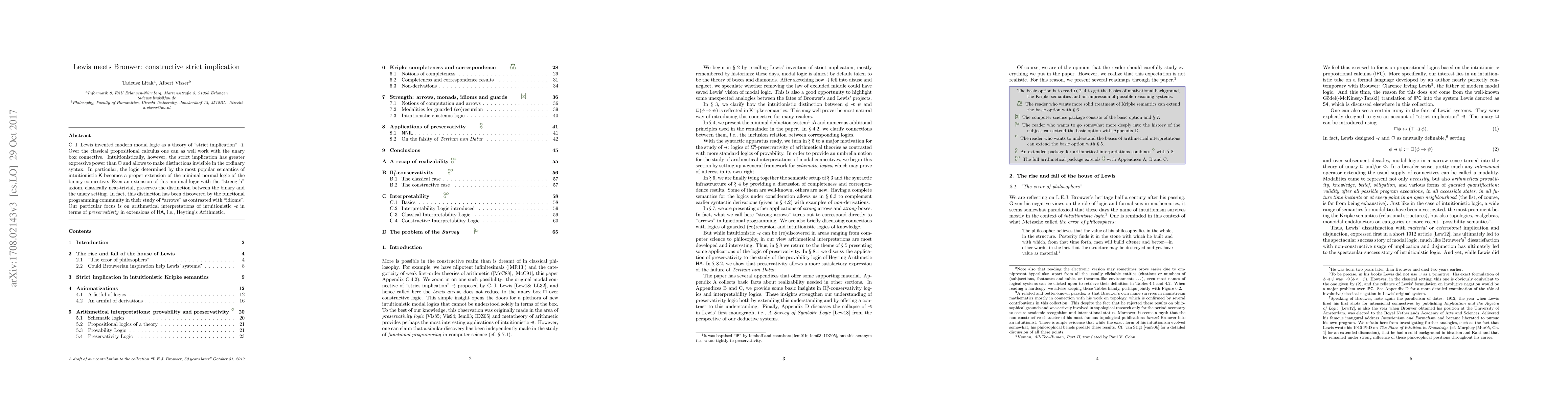The research uniquely connects Lewis's modal logic with Brouwer's intuitionism via the constructive strict implication, revealing a constructive counterpart to classical arrows in the functional programming community, thereby bridging logic and computer science.