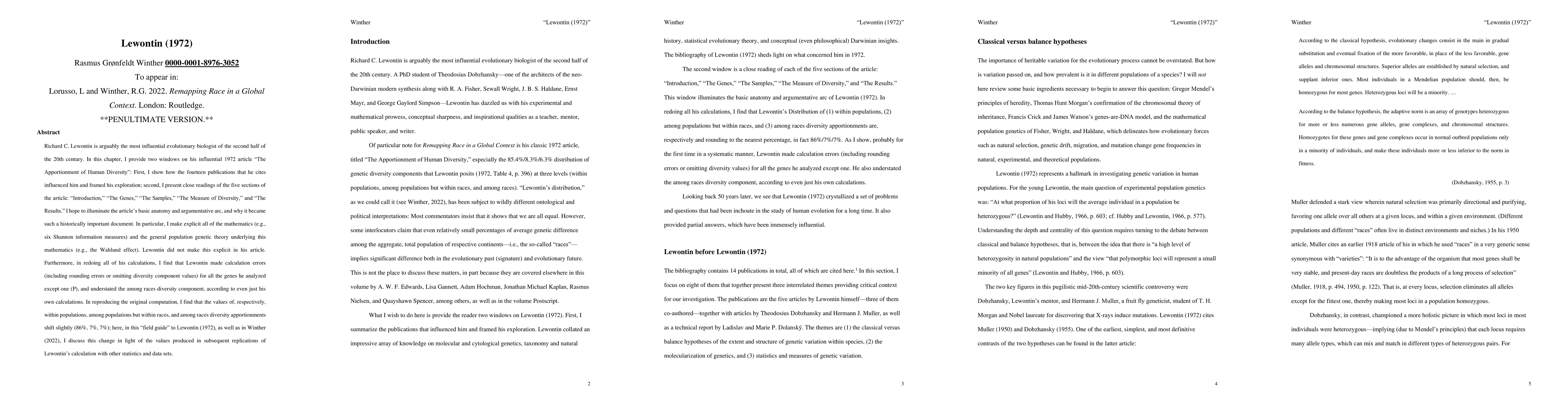 Richard C. Lewontin is arguably the most influential evolutionary biologist of the second half of the 20th century. In this chapter, I provide two windows on his influential 1972 article "The Apportionment of Human Diversity": First, I show how the fourteen publications that he cites influenced him and framed his exploration; second, I present close readings of the five sections of the article: "Introduction," "The Genes," "The Samples," "The Measure of Diversity," and "The Results." I hope to illuminate the article's basic anatomy and argumentative arc, and why it became such a historically important document. In particular, I make explicit all of the mathematics (e.g., six Shannon information measures) and the general population genetic theory underlying this mathematics (e.g., the Wahlund effect). Lewontin did not make this explicit in his article. Furthermore, in redoing all of his calculations, I find that Lewontin made calculation errors (including rounding errors or omitting diversity component values) for all the genes he analyzed except one (P), and understated the among races diversity component, according to even just his own calculations. In reproducing the original computation, I find that the values of, respectively, within populations, among populations but within races, and among races diversity apportionments shift slightly (86%, 7%, 7%); here, in this "field guide" to Lewontin (1972), as well as in Winther (2022), I discuss this change in light of the values produced in subsequent replications of Lewontin's calculation with other statistics and data sets.